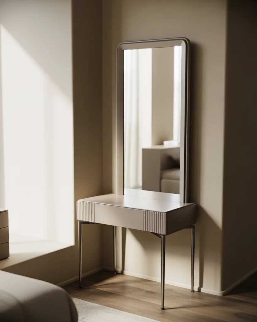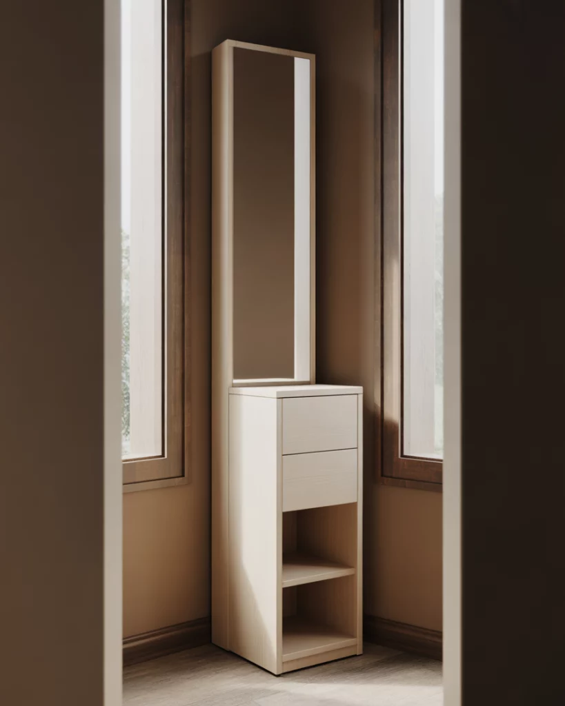 Tall and slim vanities are perfect for corner spots that are too narrow for standard tables and desks. This was seen and implemented by my friend to be placed along with her closet, and its high mirrors, high shelves, and high cabinets really contributed to an interesting and effective makeup organizer. This strategy was perfect for small rooms and apartments, maximizing every square centimeter without compromising style and cleanliness.