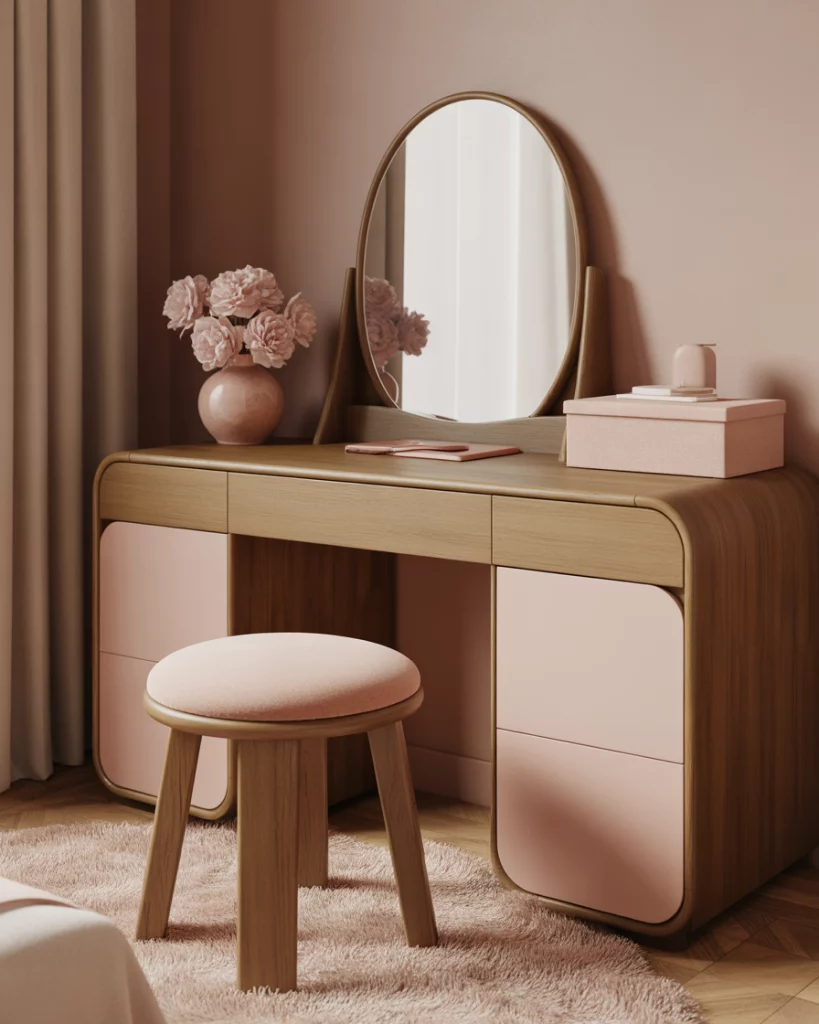 23. Wood-and-Pink Hybrid Vanity With Soft Feminine Charm