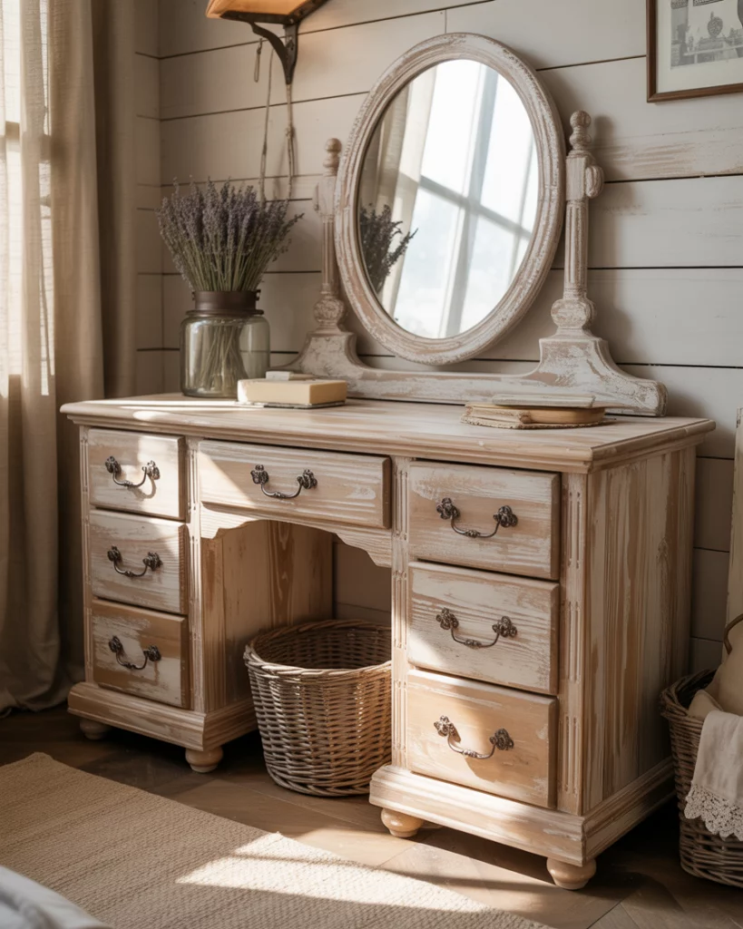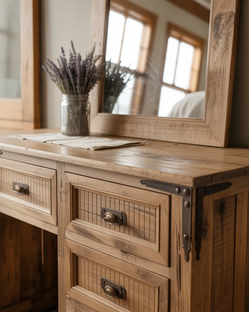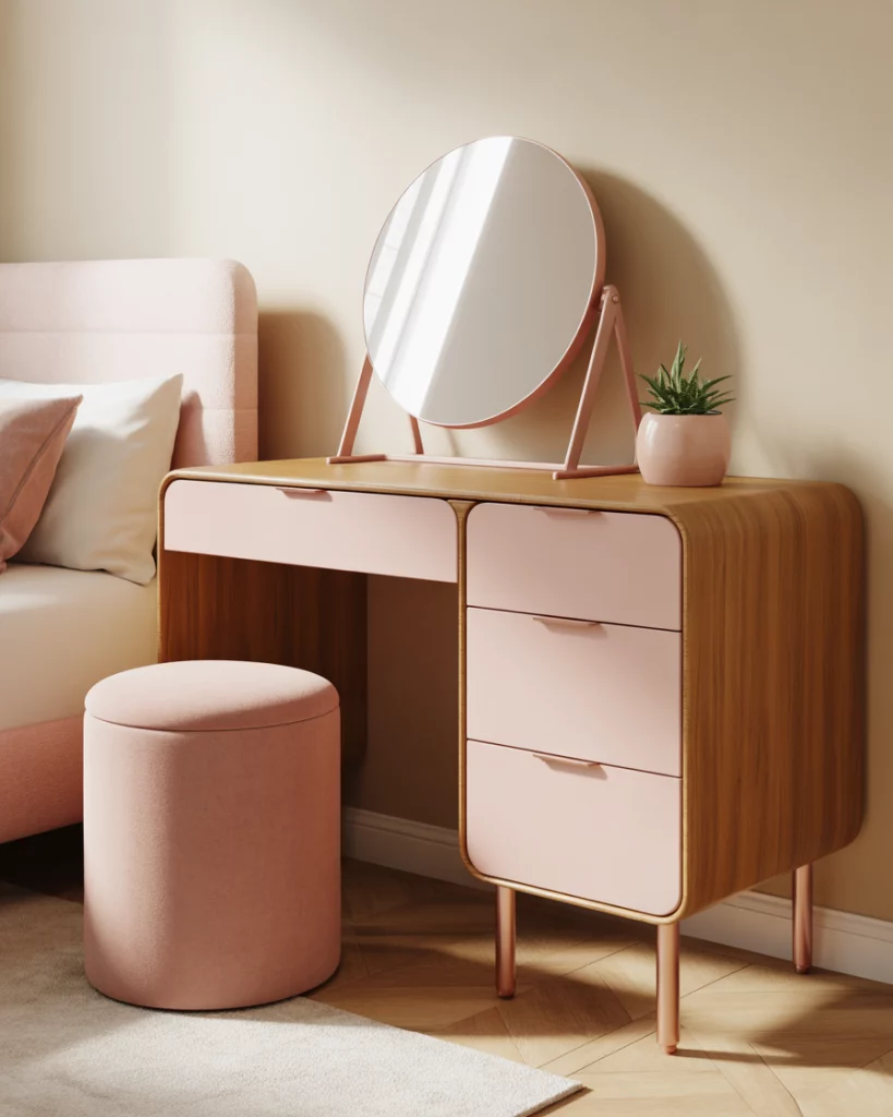 A rustic, aesthetic wood vanity suits anyone who prefers a warm, grounded style. My aunt in Vermont swears by hers—simple planks, iron pulls, and a hint of vintage patina give the bedroom character without feeling heavy. This works beautifully in cabins or traditional homes and brings a tactile warmth to your makeup routine, especially paired with woven baskets for organization.