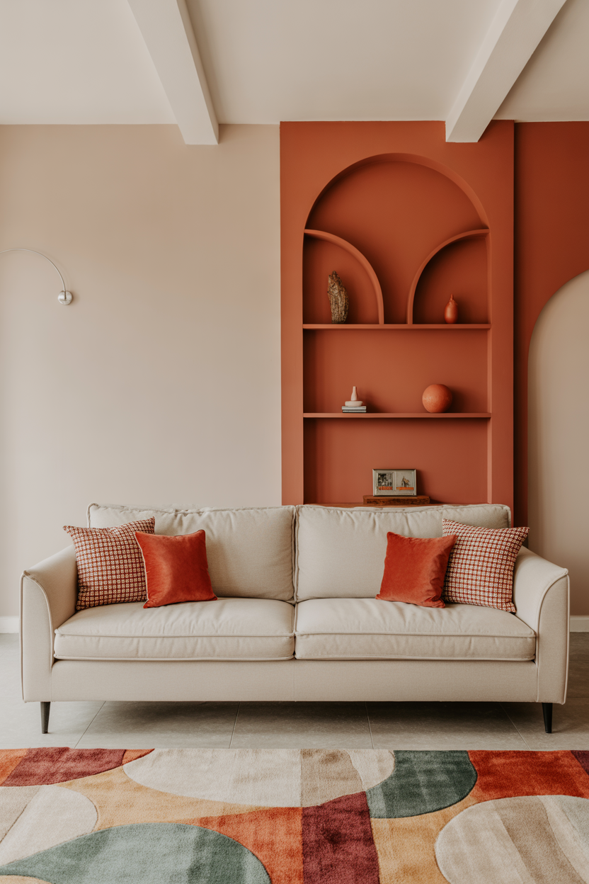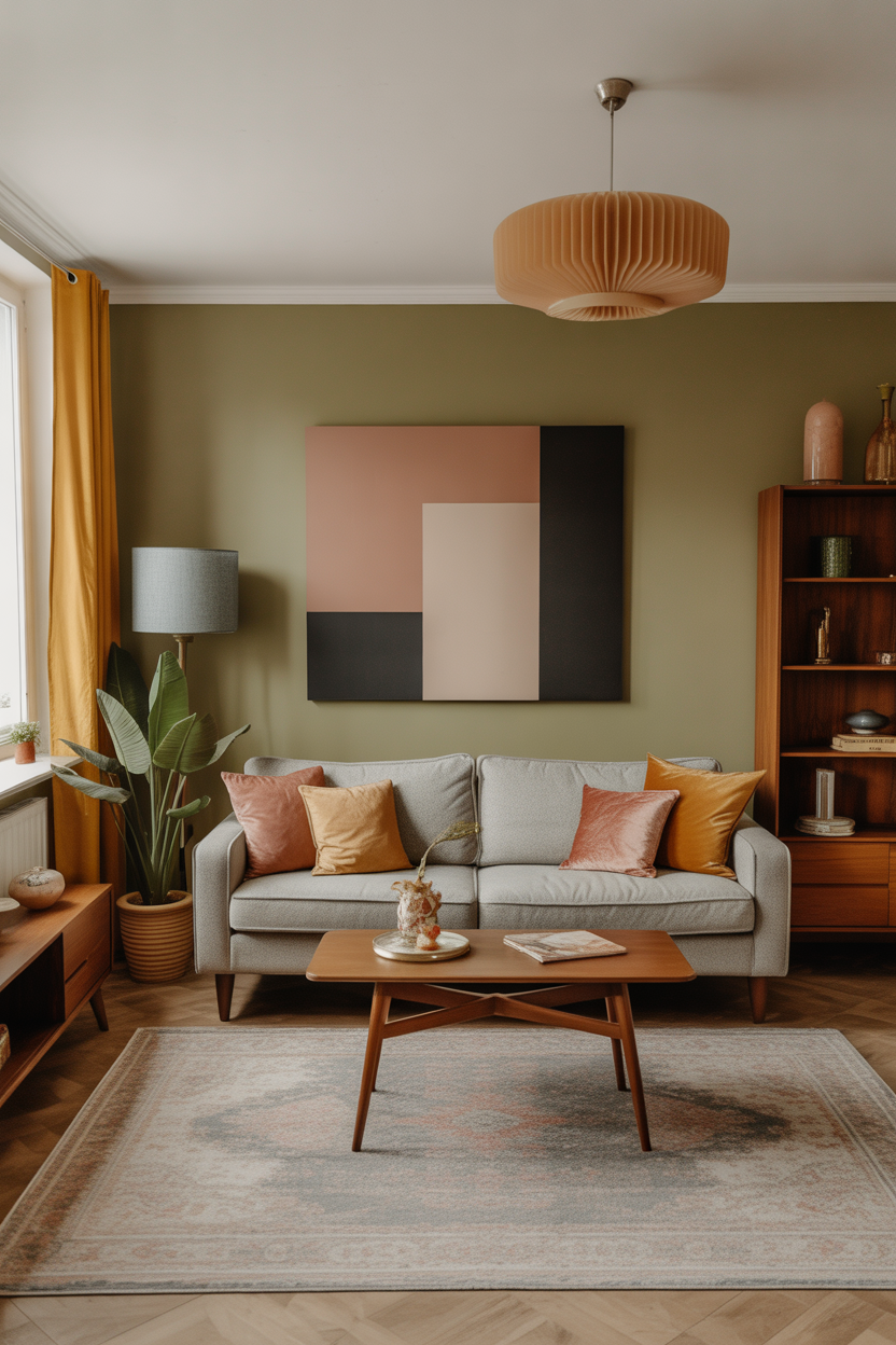 Infuse a sense of nostalgia into your living room with muted, retro-inspired tones like dusty rose, olive green, or mustard yellow. They can be painted on the accent walls, rugs or cushions in order to introduce the vintage feel in the room. Combine them with a gray sofa or a beige sofa and introduce vintage-style furniture, i.e, mid-century modernive lounge chairs or a vintage coffee table. This combination creates a charming, comfortable living room with a sense of history and style.