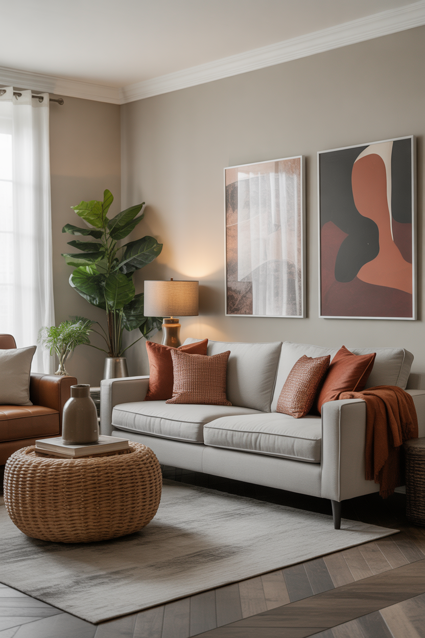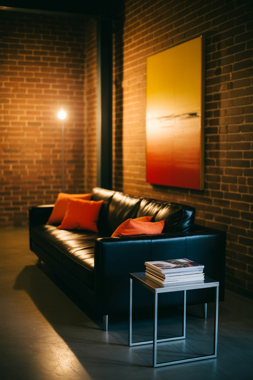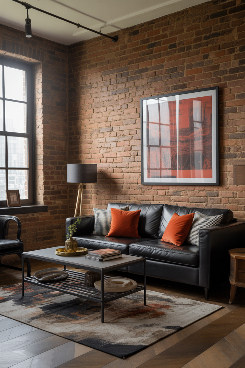 Industrial style thrives on raw, unfinished elements, paired with dark tones and metallic accents. There are exposed brick walls, and black couches, as well as metal furniture, and it feels moody and urban. To add some color, add a big contrasting accessory such as bright orange cushions, bright artwork or accent wall of the main color. Mixing them with milder colors such as greige paint on the walls make the room come out as comfortable and not so tough. This style is perfect for those who enjoy the blend of rugged materials with modern comforts.