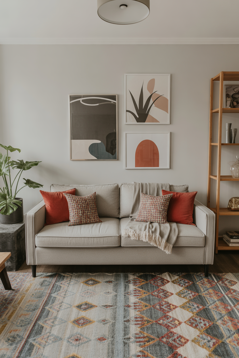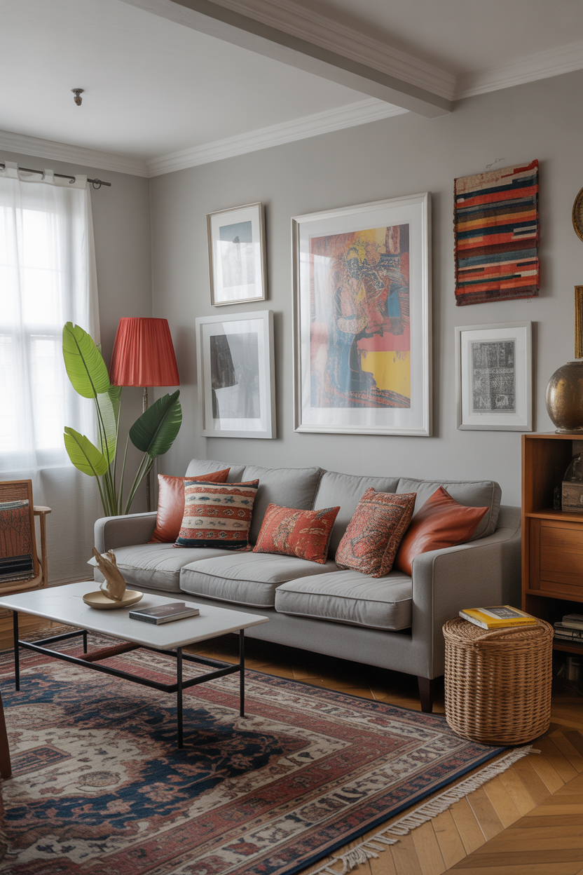 Embrace an eclectic style by mixing patterns, textures, and colors that reflect your personality and create a fun, vibrant living room. Use strong accent wall colors and mix it with a gray couch or beige couch, and overlay different rugs and cushions with contrasting prints. The more the merrier, so go floral with stripes and geometric with abstract art. The goal is to create a space that feels lived-in, comfortable, and full of life, with no rules about which colors or patterns can be used.