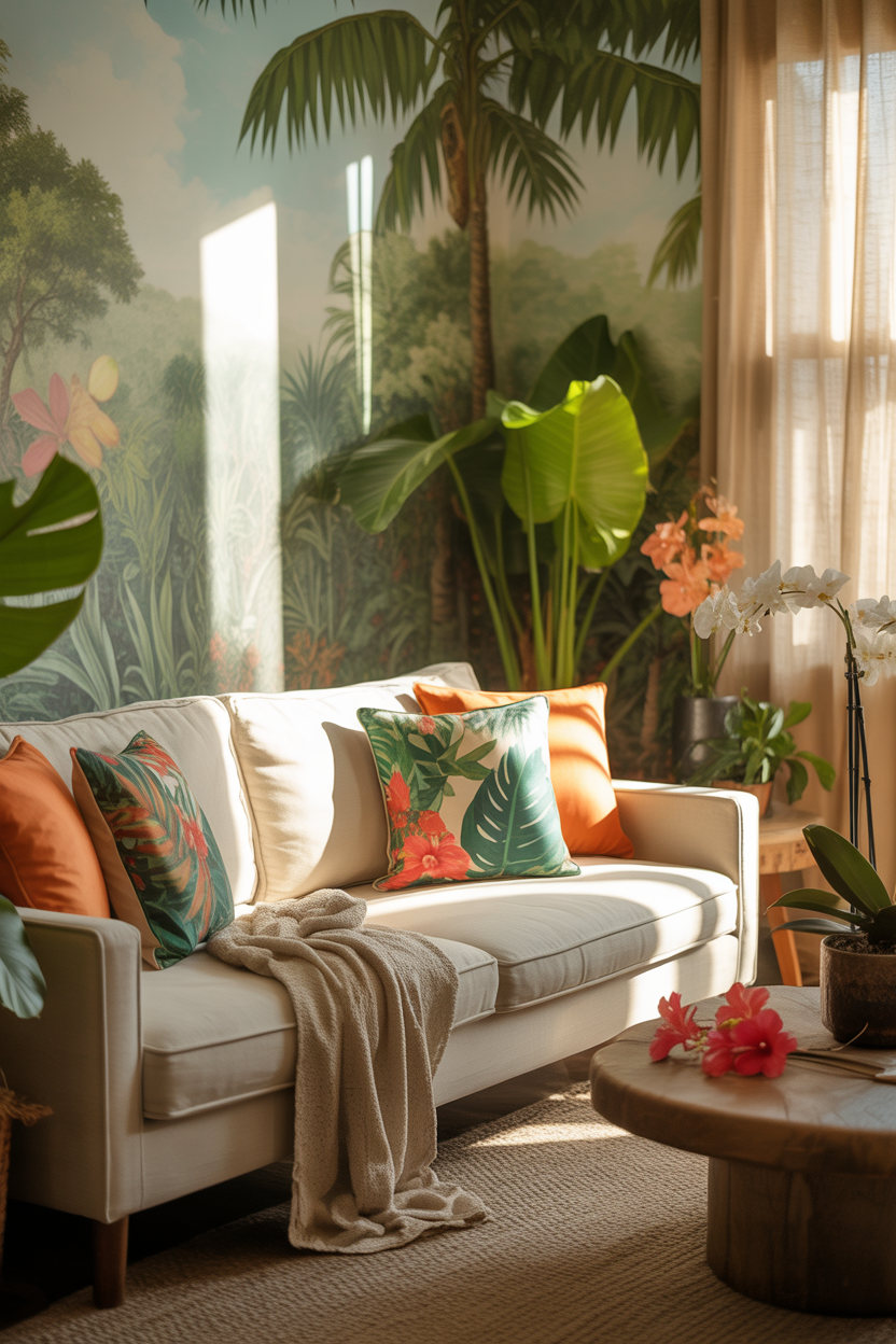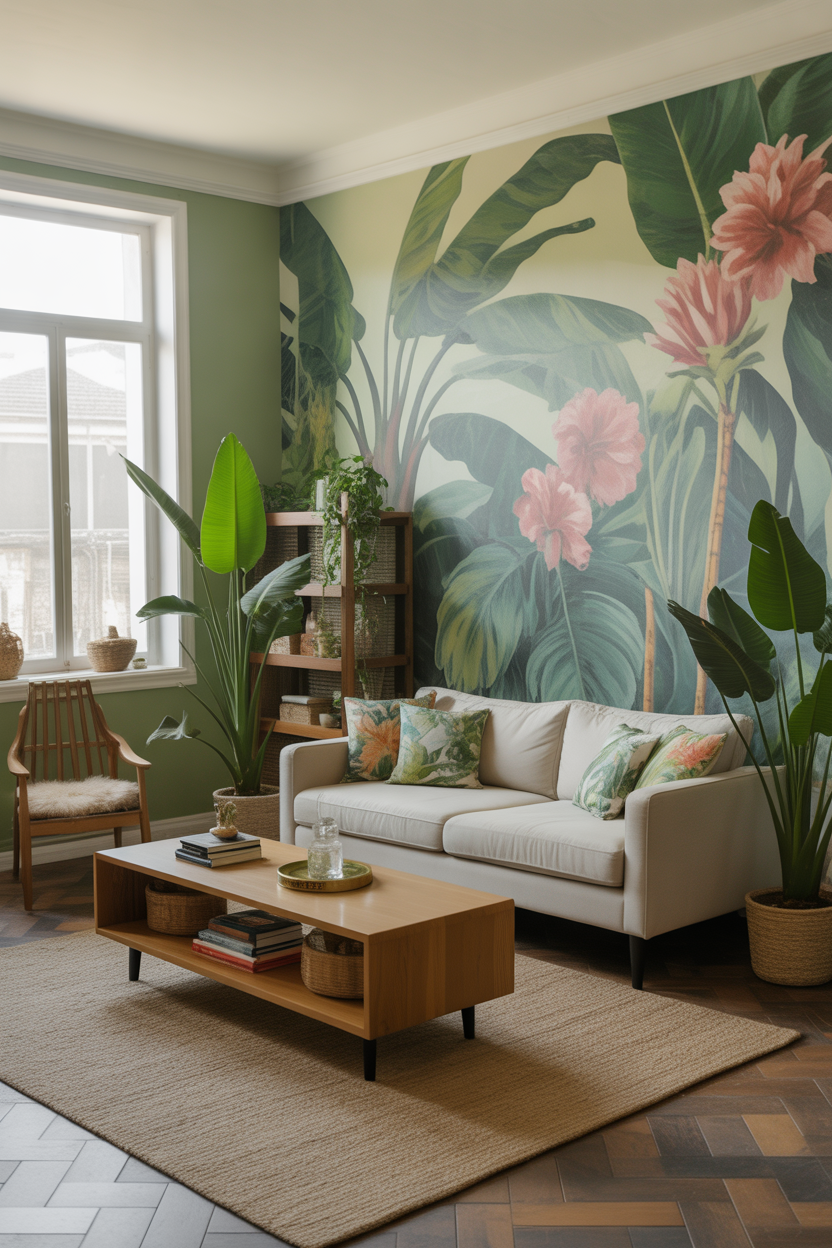 Transform your living room into an exotic, tropical retreat by using bold greens, bright florals, and natural textures. Use vibrant leafy plants either in the form of ferns or palms and use tropical focused paint on the walls like teal or lime. The neutral background could be provided by a beige couch and the actual tropics should be achieved by using accent items such as the tropical printed cushions, lush rug and woven baskets. This vibrant yet relaxed design makes the room feel fresh, lively, and full of nature-inspired beauty.