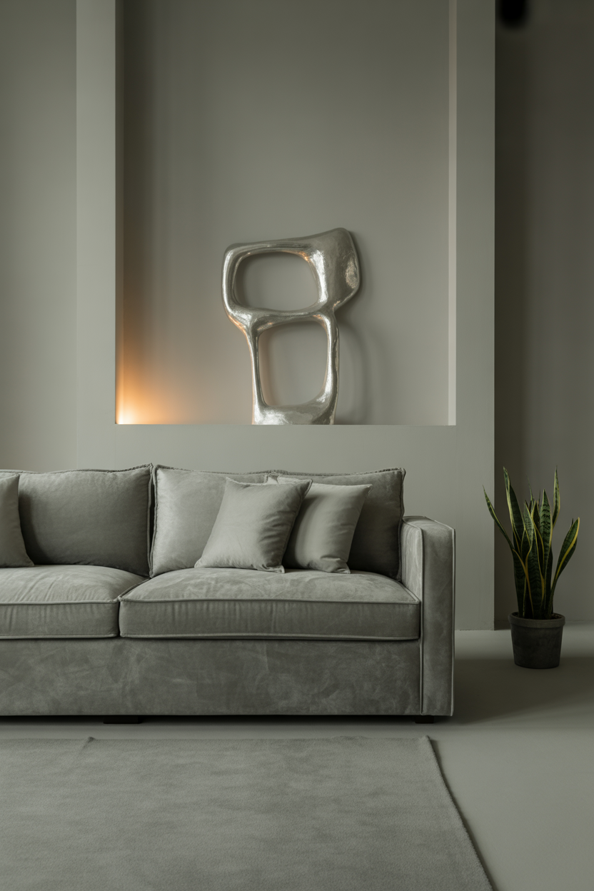 For a sleek, modern aesthetic, try creating a monochromatic grey living room. Such style incorporates the different gradations of grey color on the walls, along with a grey couch and complimentary items. Metallic accents, soft grey cushions and a greige paint accent wall all look good together and create a sophisticated and harmonious look. The absence of bright colors in favor of subtle contrasts helps the room feel calm and chic, making it an ideal choice for those who prefer a minimalist yet refined style.