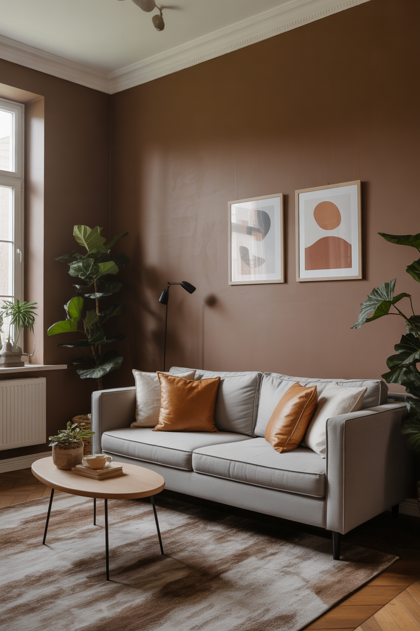 Toupe, a versatile color that straddles the line between brown and grey, works wonders in creating a cozy, earthy vibe. The Toupe walls and a gray couch or beige couch give stylish but at the same time down to earth look. To add some nature and coziness to the room, one can accentuate the space with dark wooden furniture or some soft green colors. Minimalism of the décor, along with the earthy coloring, makes it possible to create a quiet relaxing living room where you can rest after great day. The sofa can also be the focal point of the room, complemented by soft textiles that enhance the overall comfort of the space.