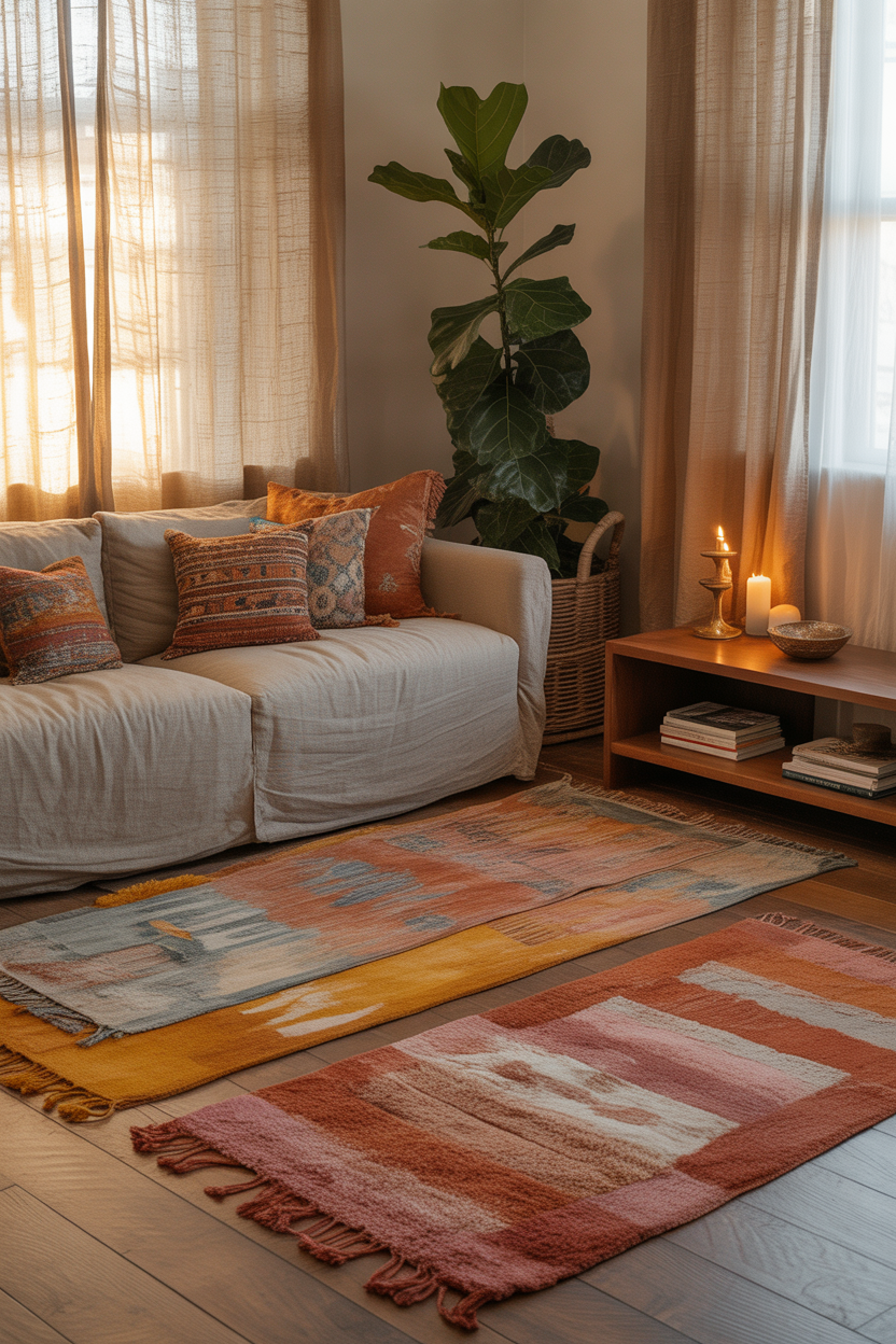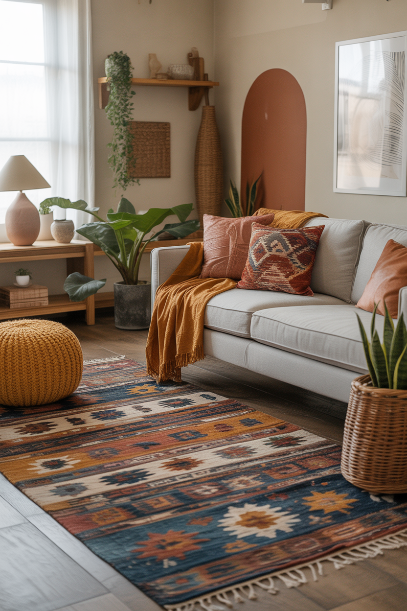 A boho style living room is the epitome of warmth, personality, and comfort. A multicolored mix of rugs, textured throws and patterned pillows will give a vibrant and friendly atmosphere. The terracotta, mustard yellow and rust colors of the earthy tones are capable of blending with a beige couch or gray couch. With a combination of solid color and eclectic patterns, this style accepts a combination of primary and warm colors. Accessories such as woven baskets, wooden furniture, and plants bring an element of nature to the room, making it feel both lively and grounded.