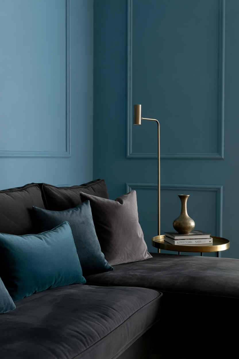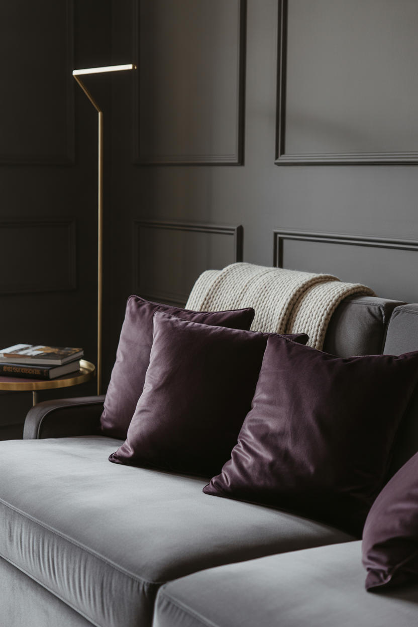For a more dramatic effect, go for moody dark tones with a rich contrast. You can use charcoal, navy, or deep plum, which creates a sophisticated mysterious atmosphere in the room. To make the luxurious effect even more lavish, combine these colors with the intense textures like velvet cushions or a deep wooden furniture. Gray couch or beige couch may be used as a neutral balance in the room as it would be warm against the deep colors. Use lighting strategically to highlight the accent wall and emphasize the depth and richness of the space.