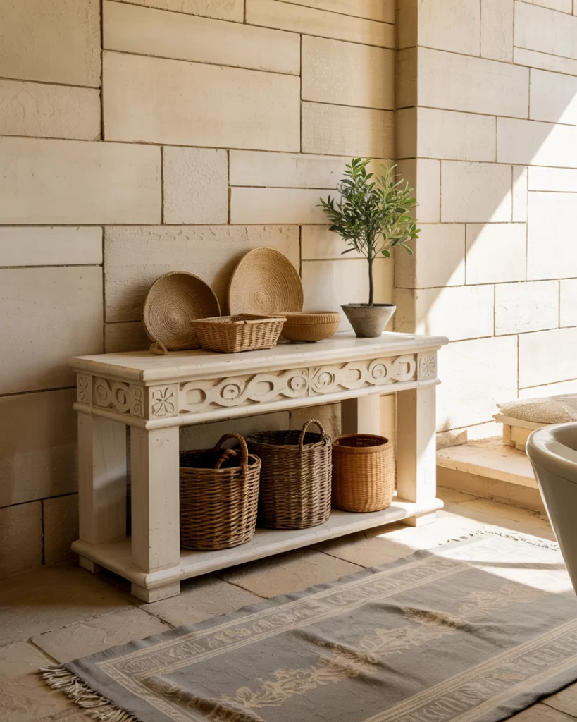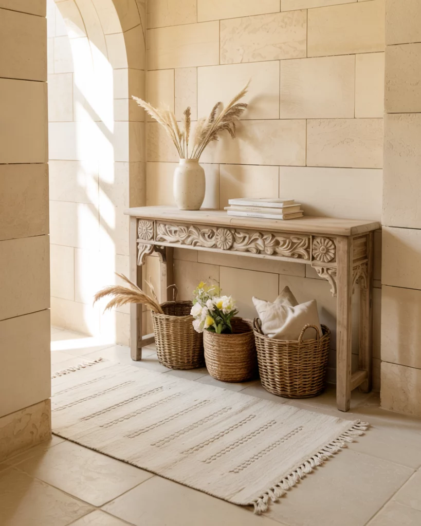 A desert-inspired home has toned-down entryways in sandy colors, woven baskets, and stones. A beige rug and console table provide a warm entrance. A touch of farmhouse or old market ideas can provide the leisurely feel as soon as one steps inside. In ranch-style American homes located in regions like Arizona and Texas, the entry has also become a “parking lot” type of zone. In this case, the materials must be sturdy and resilient but also aesthetically wonderful.