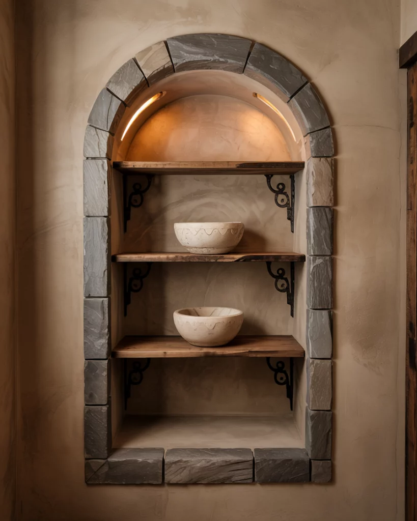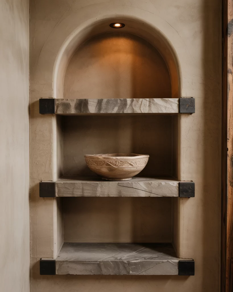 The niche in the home has transformed from a simple storage area into a stylish feature. Place your preferred bathroom items on the shelves of the niche within the home. Mount the carved wooden bowls inside the home environment. This arrangement can be complemented inside the home environment through the addition of the dark materials of the metal type inside the home’s bathroom environment. The addition of dark elements of the metal type will surely provide a serenity effect in the home environment. The ranch spa trend has the potential to create the desired effect in the home setting. One of the pitfalls of incorporating this trend might be overfilling the niche. The display needs to be toned down to avoid overload as the architectural statement takes center stage.