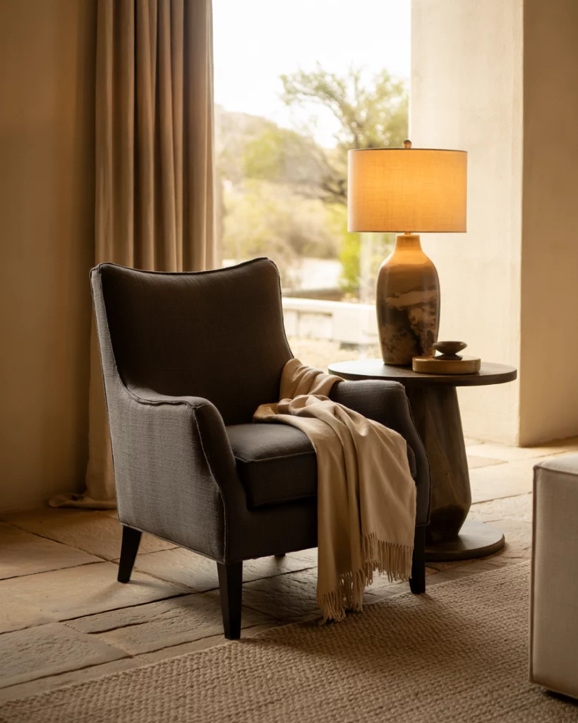 The dark charcoal and midnight blues bring luxurious touches to Western decor. The color will complement dark woods, desert neutrals, and curvy decor. A ranch-style living room will get an infusion of depth through the accent chair. Add warm lighting and dramatic textile decor. This real homeowner behavior demonstrates the growing trend of consumers opting to upgrade their homes through accent chairs first—the fastest fix in the decor overhaul universe!