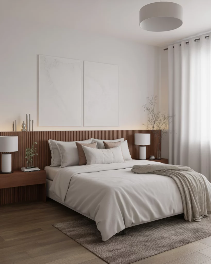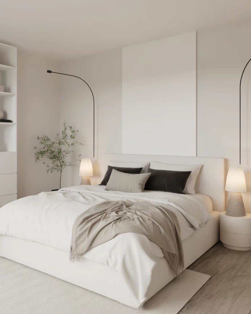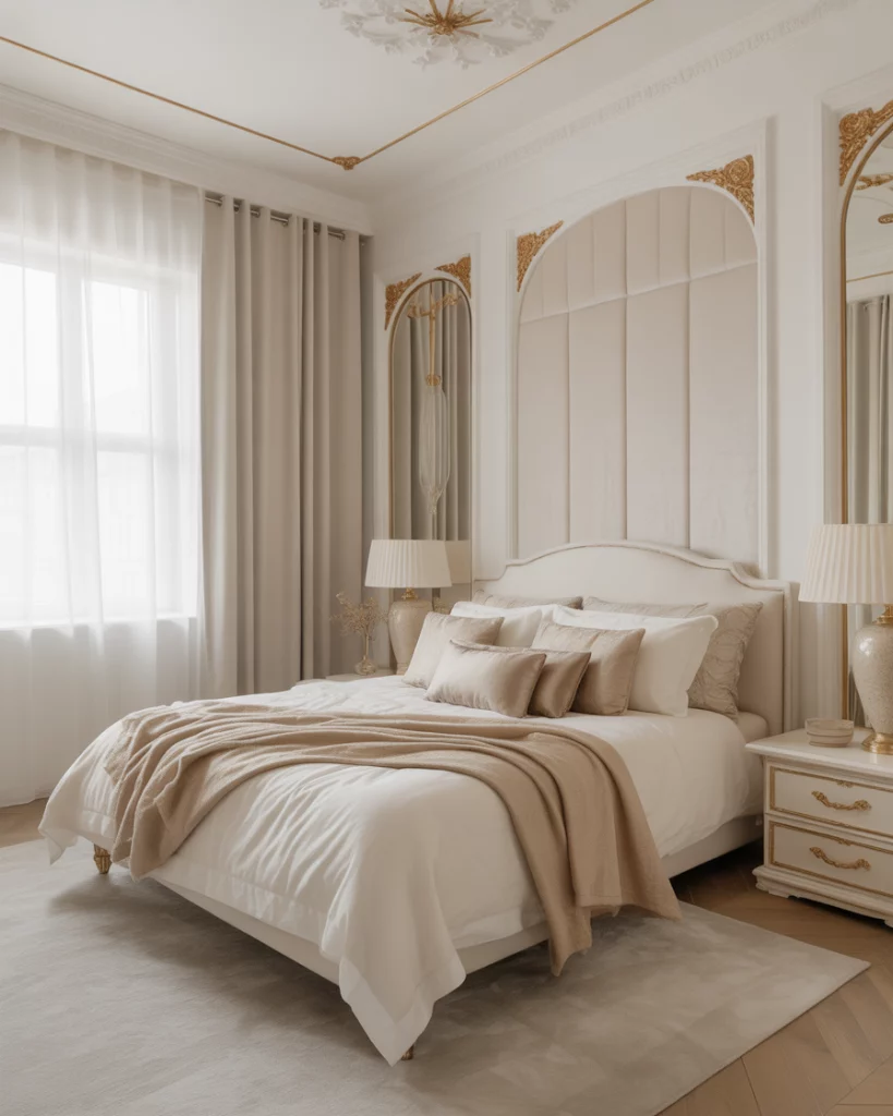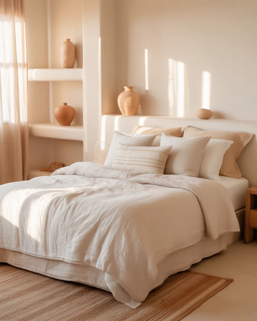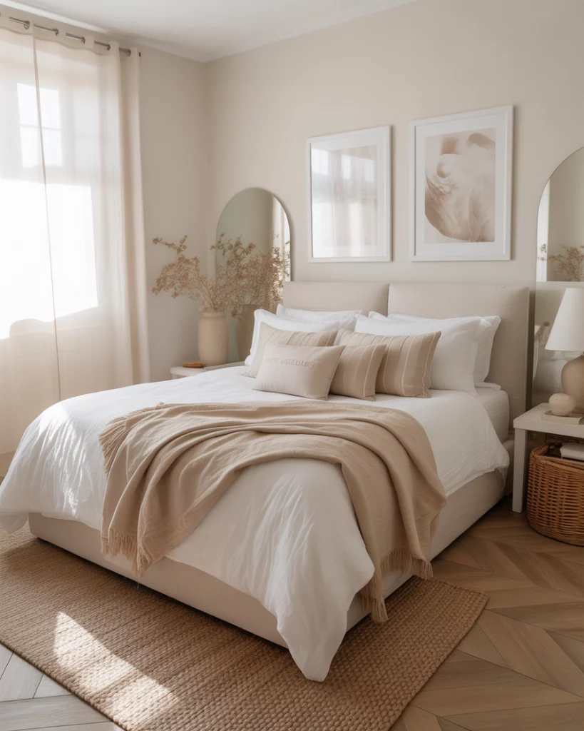 White paired with muted Beige and warm sand tones creates a serene bedroom inspired by desert retreats. This aesthetic works beautifully in a modern home where you want simplicity without starkness. A designer once told me that beige “lets white breathe,” and I’ve found it especially soothing for couples wanting a peaceful, grounding setting.