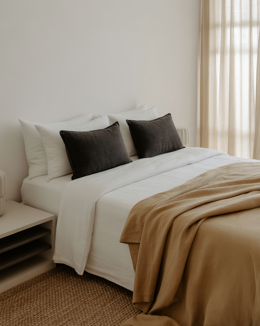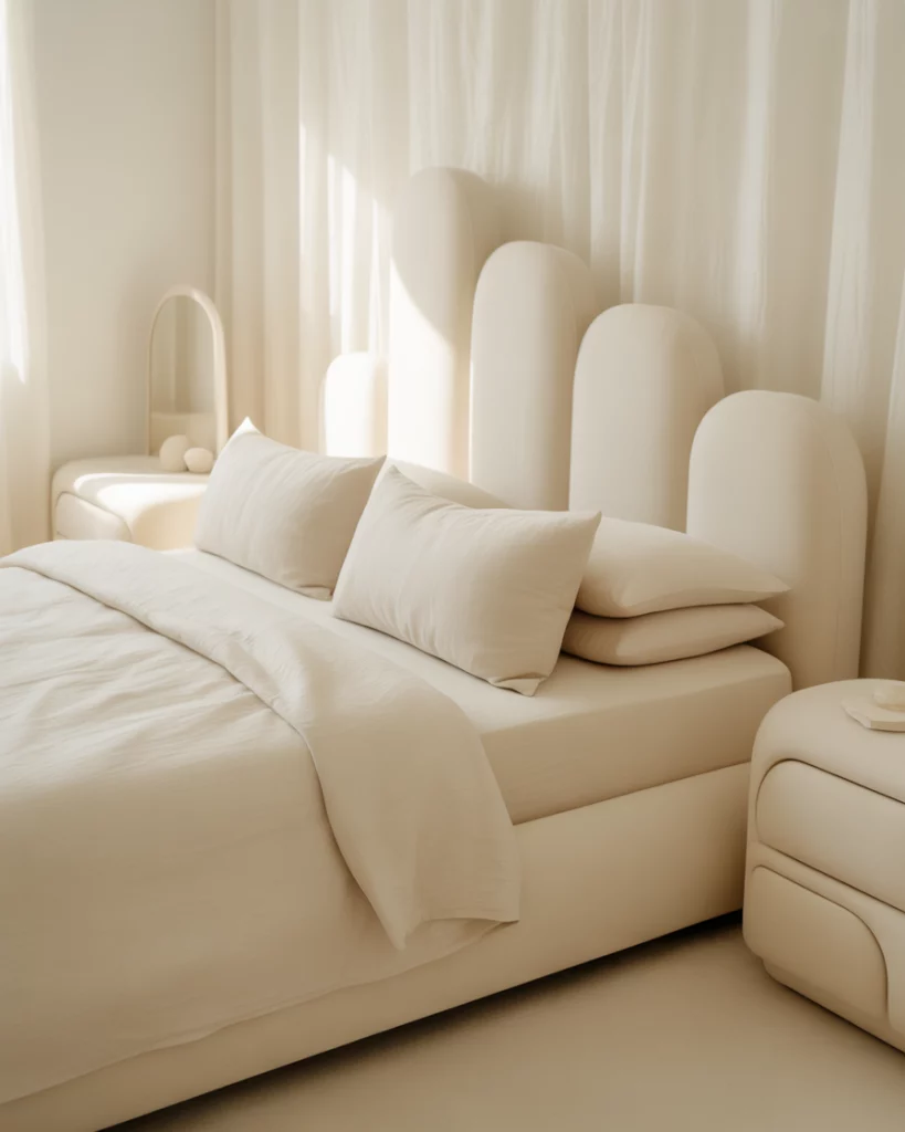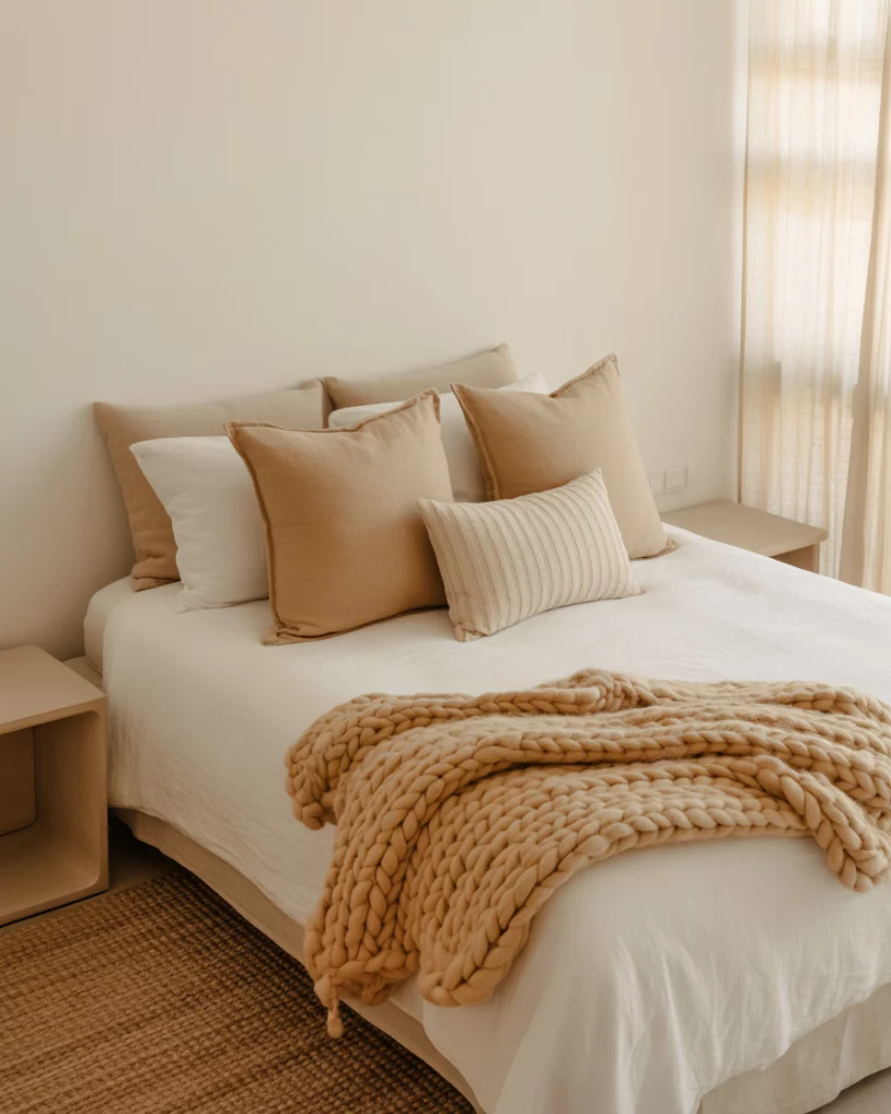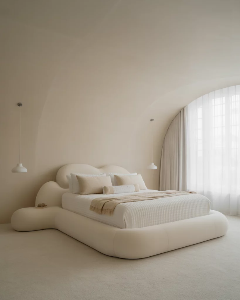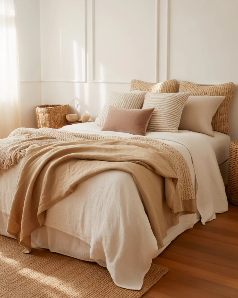 White paired with muted Beige and warm sand tones creates a serene bedroom inspired by desert retreats. This aesthetic works beautifully in a modern home where you want simplicity without starkness. A designer once told me that beige “lets white breathe,” and I’ve found it especially soothing for couples wanting a peaceful, grounding setting.