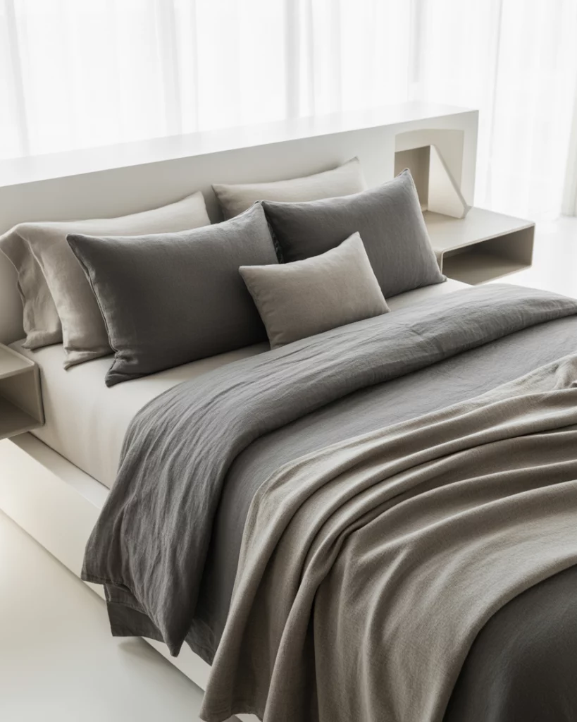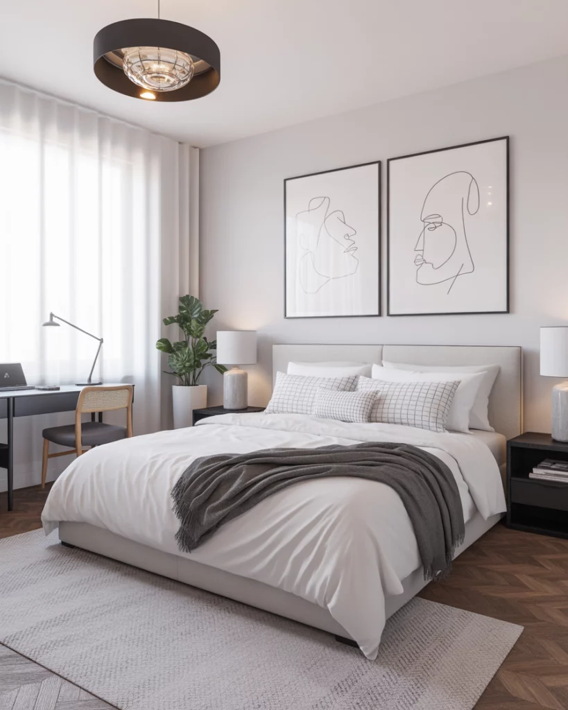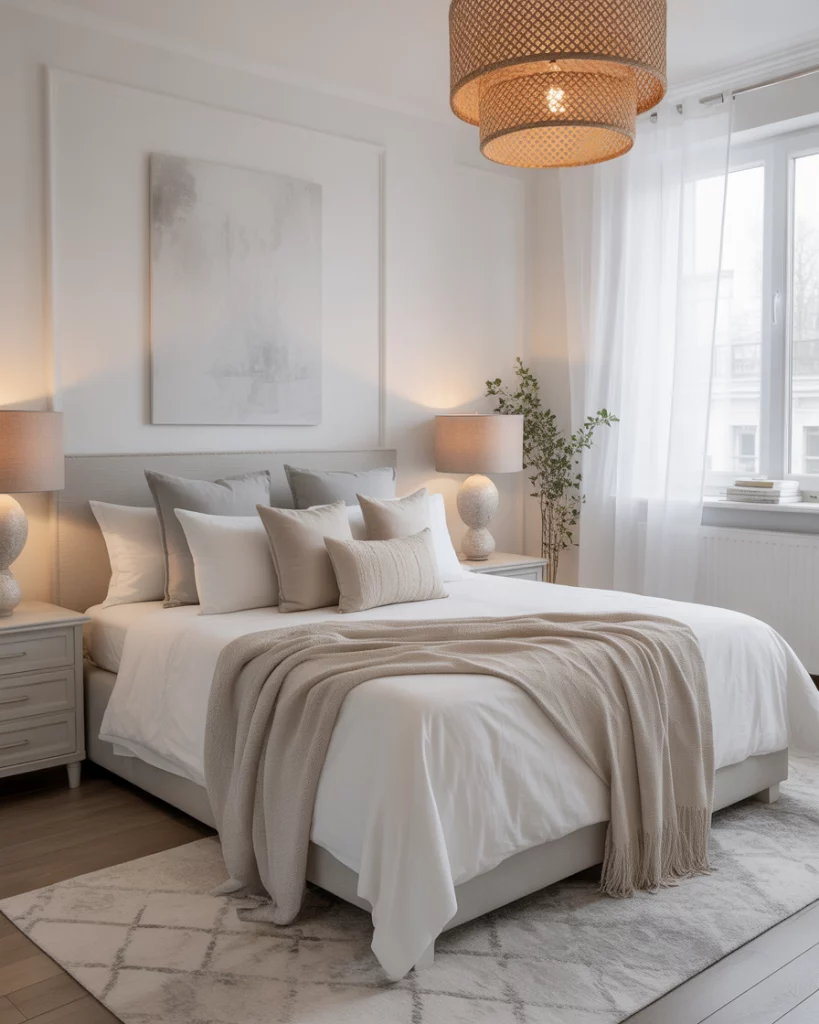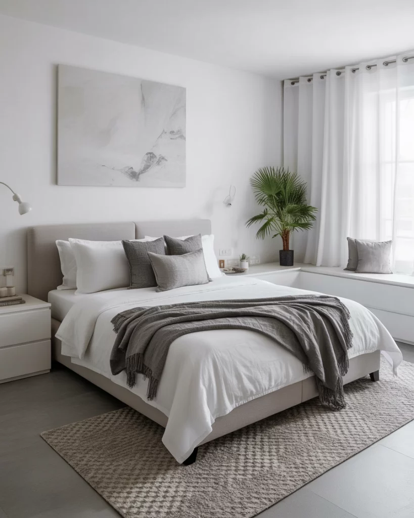 Layering white with soft Grey and cool neutrals creates an elegant, hotel-caliber bedroom. I used this combo when refreshing a rental property, and guests often commented that it felt “effortlessly expensive.” It’s a great foundation for anyone wanting a modern look without going bold.