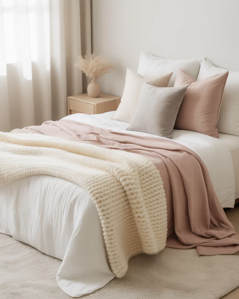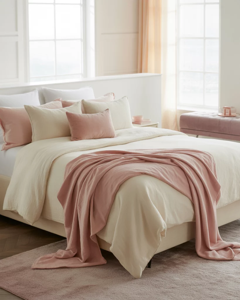 Blending white with Cream and, Gray and, and Light grey pink hints gives a layered, welcoming look you often see in wellness retreats. These tones warm a space without heavy contrast. A decorator I follow on Domino says these hues “feel like morning light,” and after trying them at home, I completely understand why.