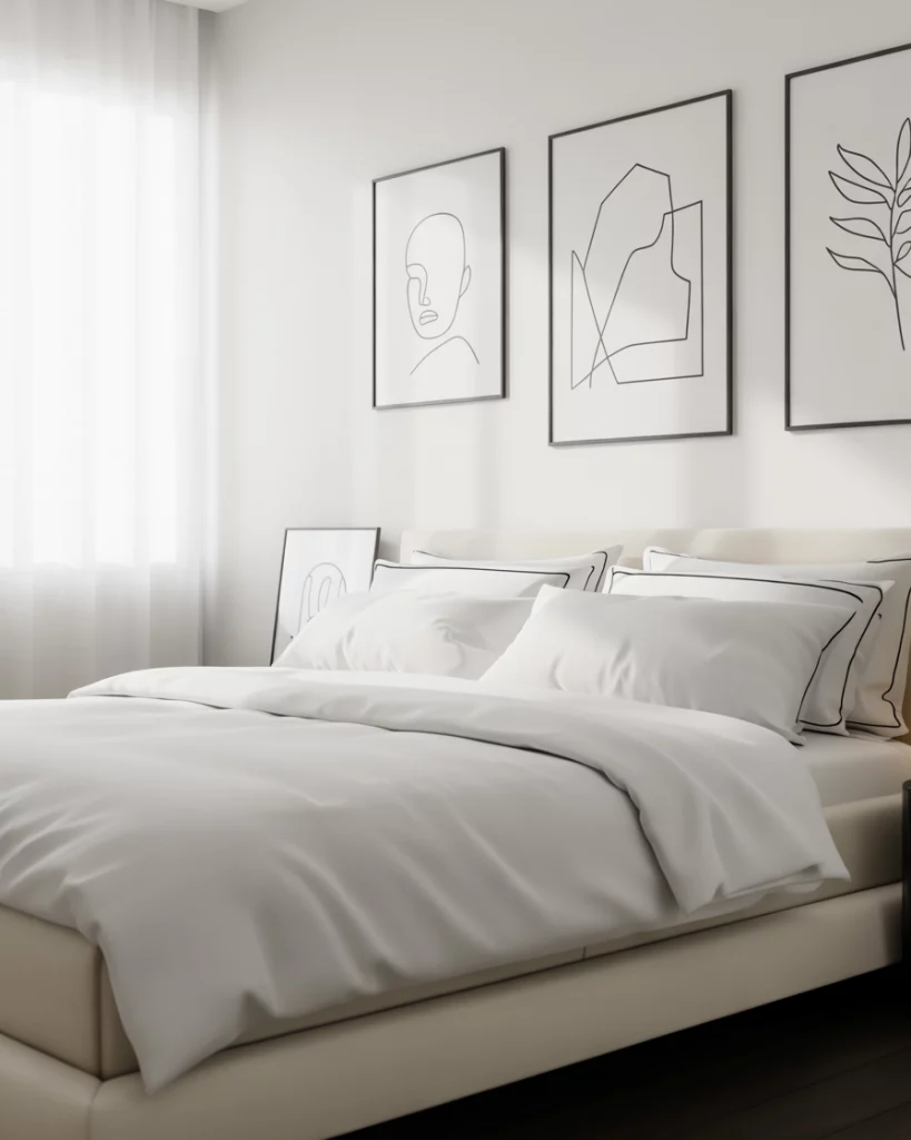 A pared-back white bedroom becomes richer when soft contrasts like Black and, Grey and, and Beige and appear in textiles or artwork. This Aesthetic look works in any small room, especially when you want a calm space without clutter. I learned this while helping a friend downsize—removing extras made her room feel instantly more cozy.