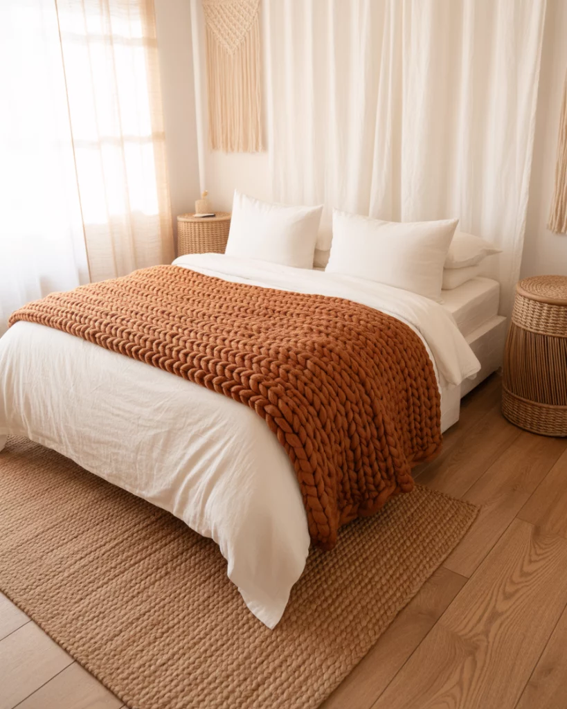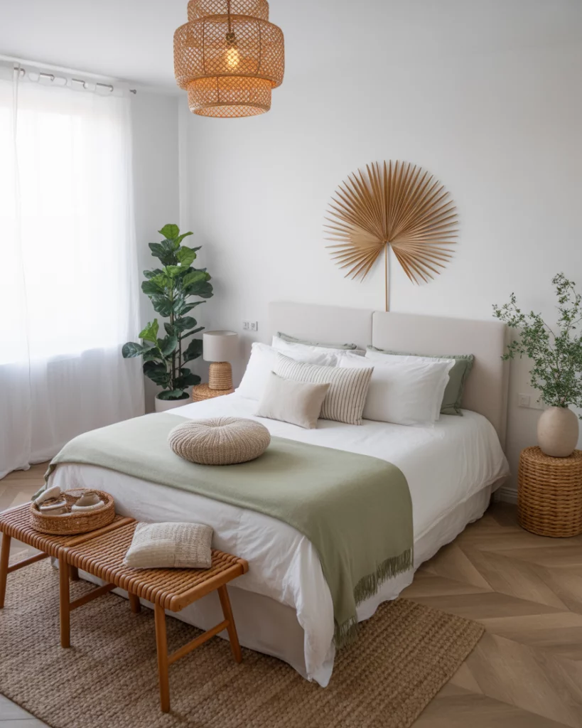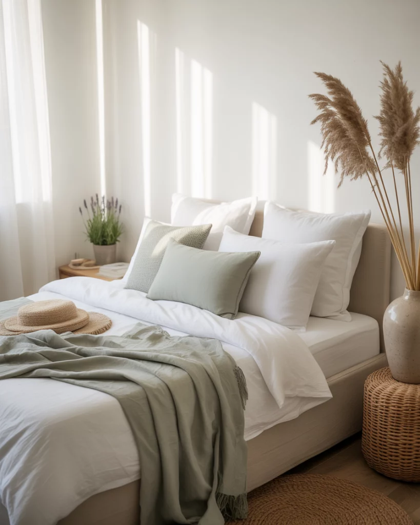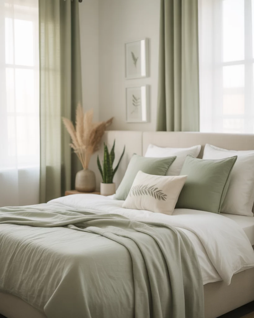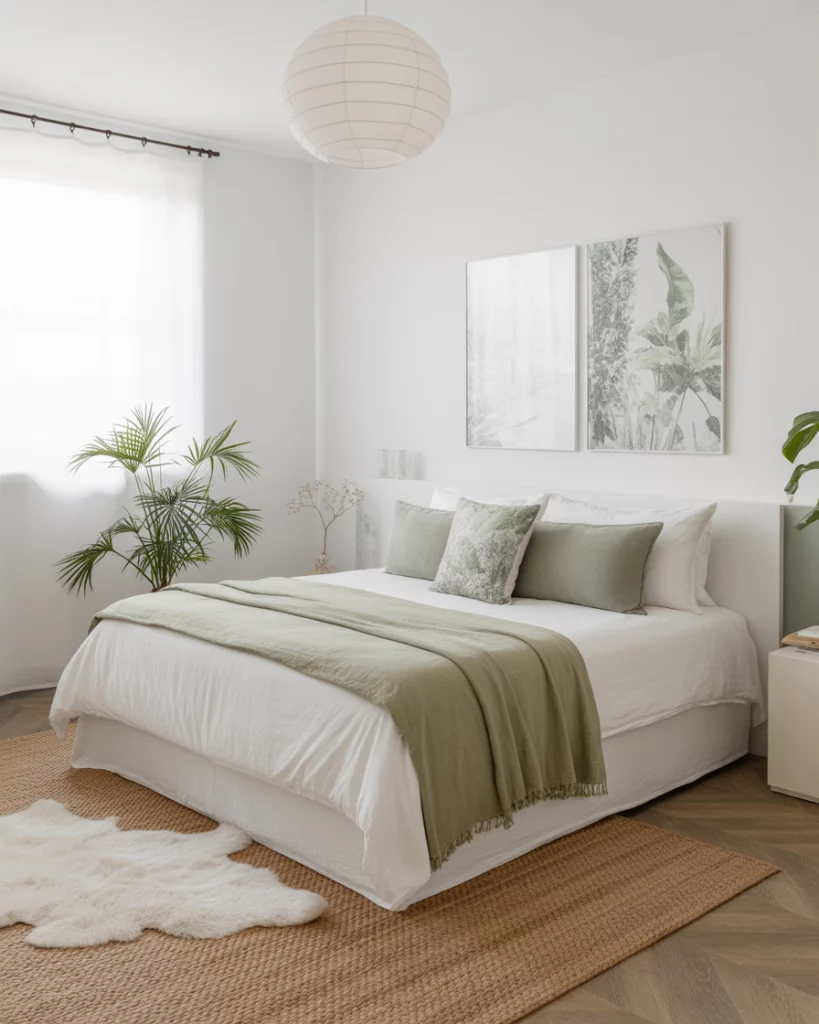 Combining white with tones of Green and, Sage green, or organic materials creates a refreshing, grounding atmosphere. This idea is ideal for small room layouts that need life without visual clutter. When I added sage linens to my own room, it immediately felt more balanced—almost like sleeping closer to the outdoors.