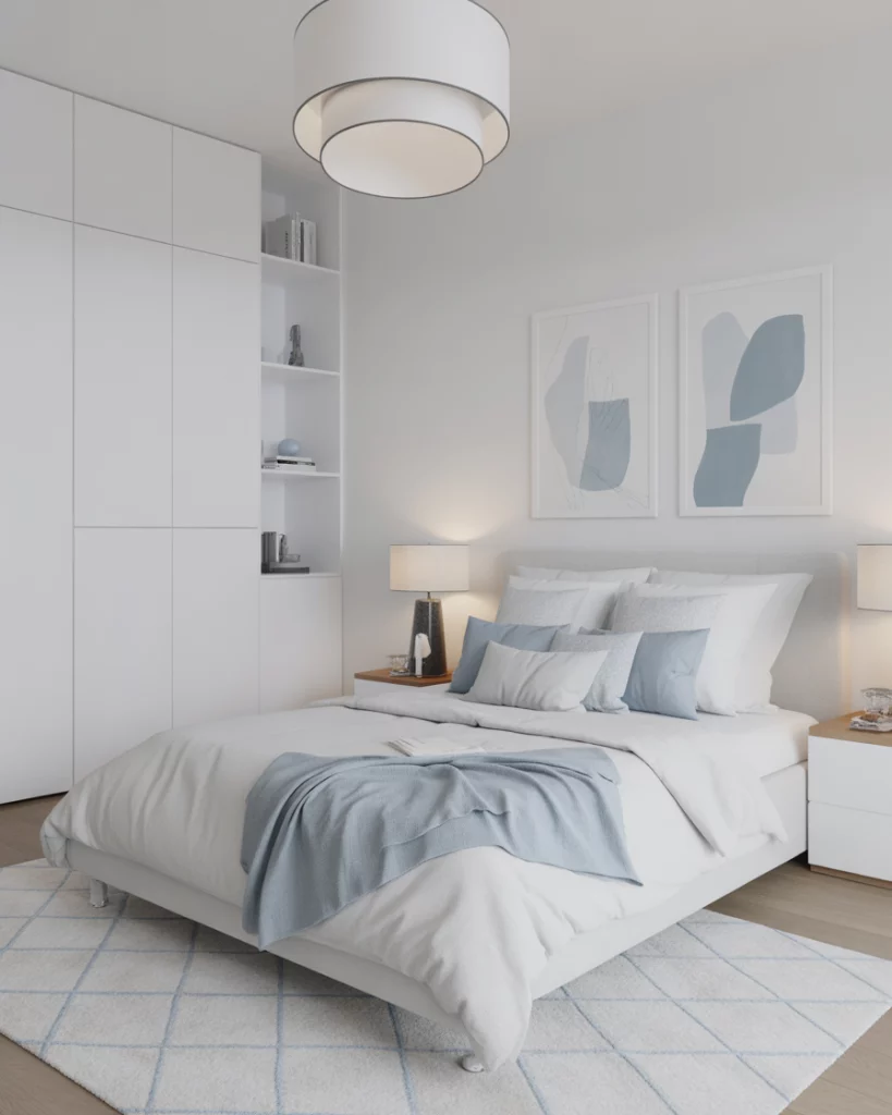 If you want a gentle touch of color, mixing white with Light blue creates a soothing palette ideal for winding down after long days. This scheme works beautifully in a small room because it stays airy while still adding personality. A decorator from HGTV once said pastel blue “lowers visual noise,” and she wasn’t wrong.