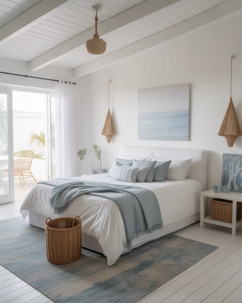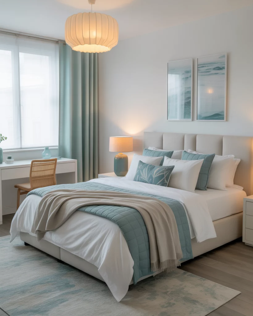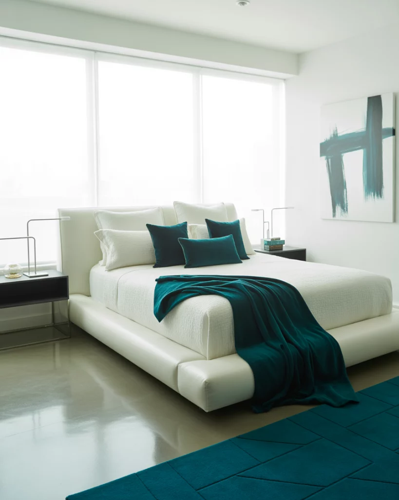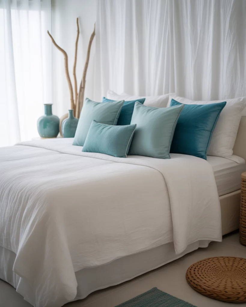 A mix of white and Teal and creates a soft, refreshing palette ideal for retreat-like bedrooms. This style works well with color accents that stay calm rather than loud. I tried teal pillows in a client’s small room, and the space suddenly felt more intentional—like a thoughtfully curated spa.