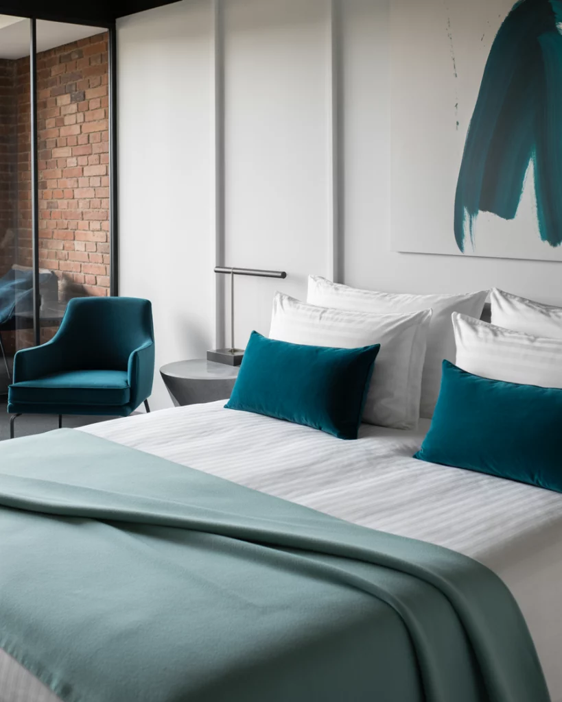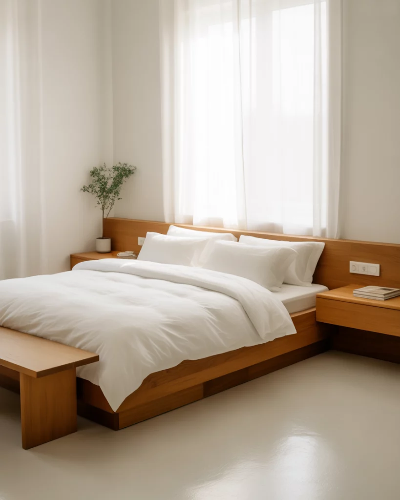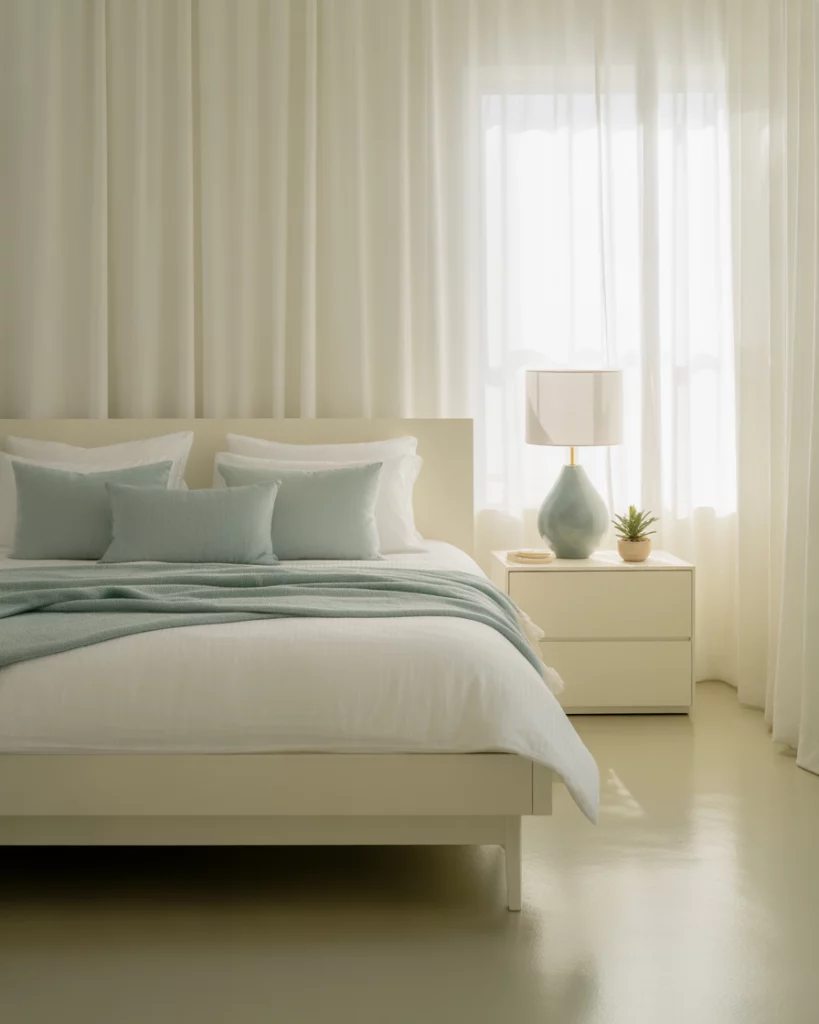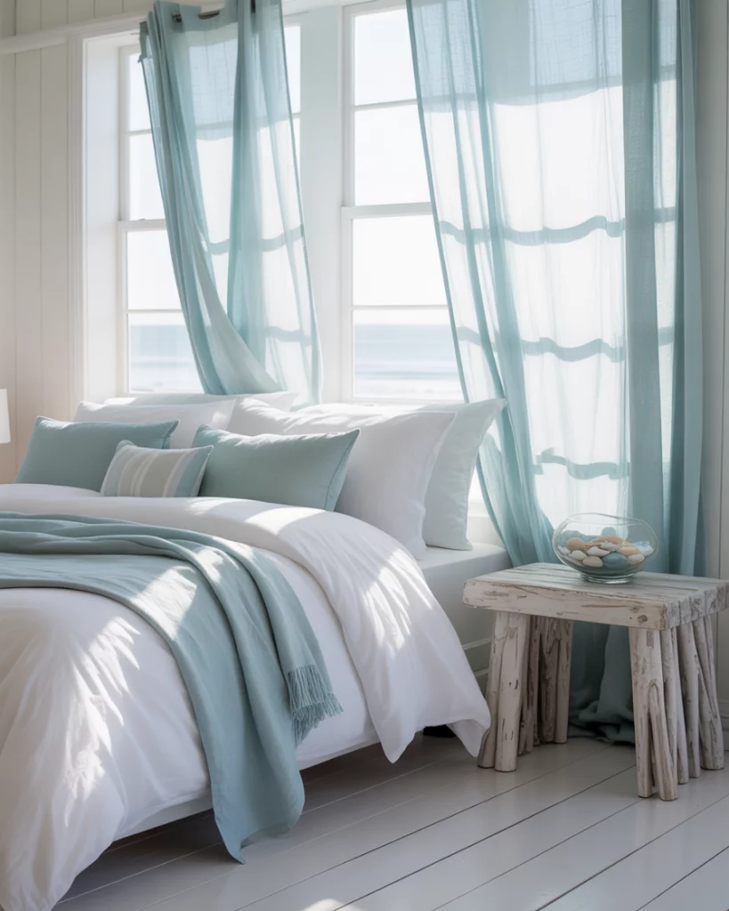 A mix of white and Teal and creates a soft, refreshing palette ideal for retreat-like bedrooms. This style works well with color accents that stay calm rather than loud. I tried teal pillows in a client’s small room, and the space suddenly felt more intentional—like a thoughtfully curated spa.