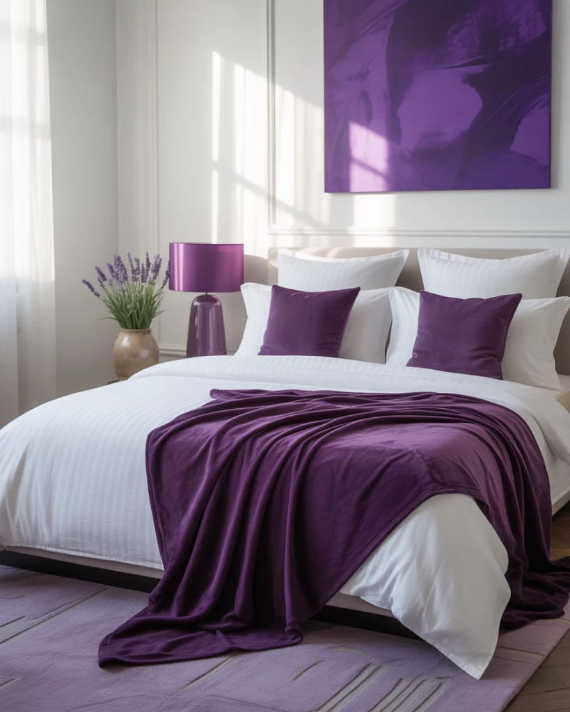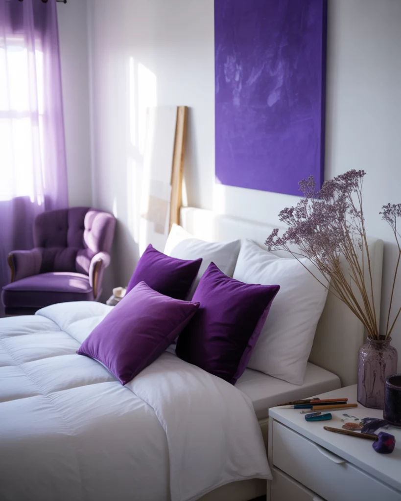 White walls allow Purple and muted violet tones to feel sophisticated rather than overpowering. This idea is perfect for teens or artistic personalities who want a bedroom with subtle drama. I once styled a lavender throw on a white bed, and it introduced just the right touch of playful refinement.