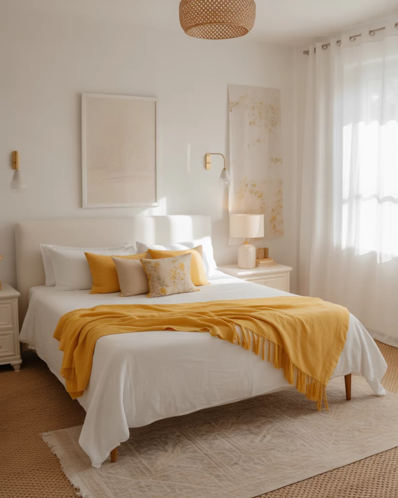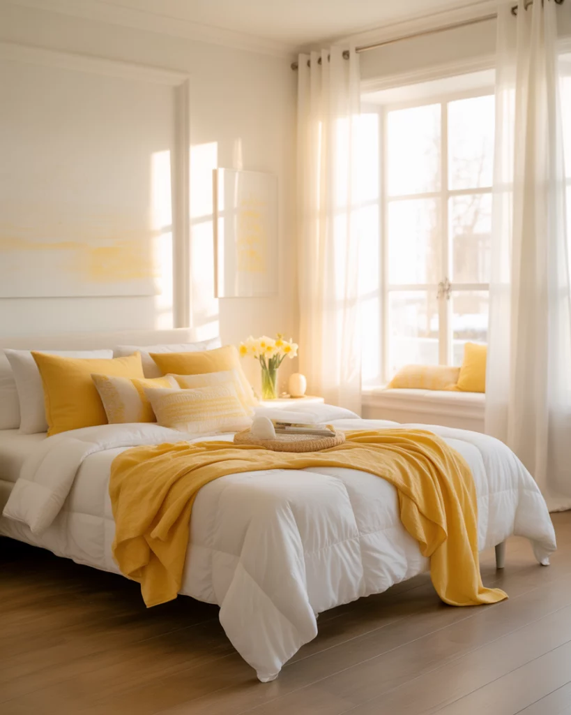 Adding touches of Yellow and light golden fabrics gives a white bedroom an uplifting, cheerful feel. This style works especially well for those living in darker climates where extra brightness helps combat gloomy days. I saw this used in a friend’s Seattle home, and the transformation was instant.