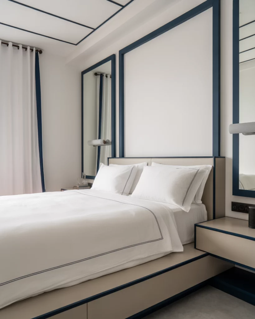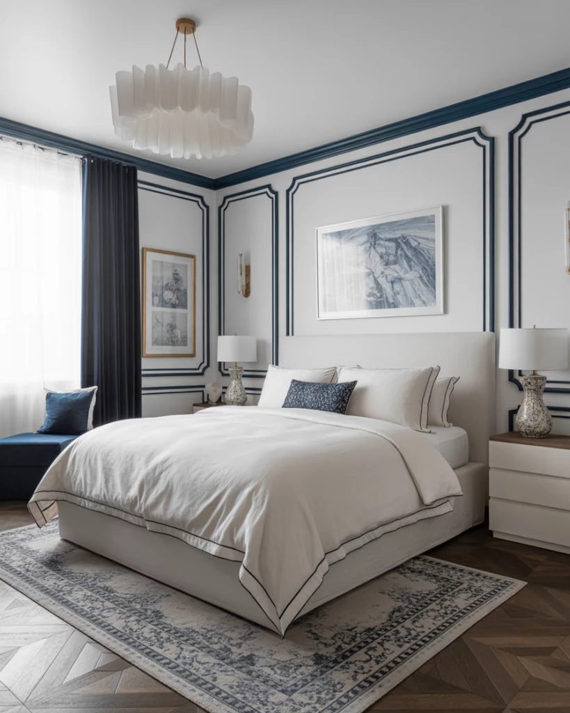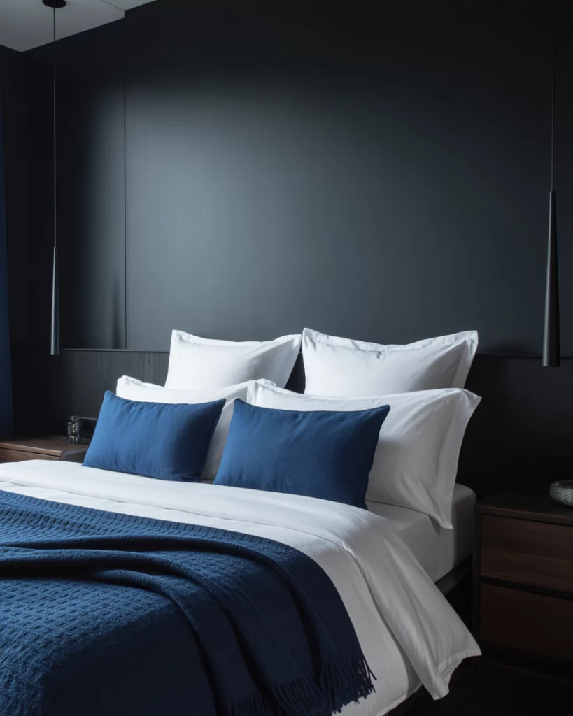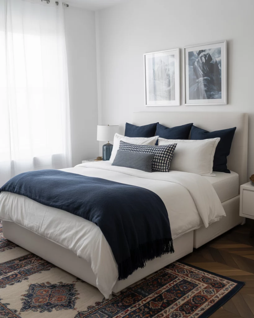 If you love contrast but want something more sophisticated than black, deep navy is the way forward. Pairing a white base with Navy blue or Navy and fabrics gives the bedroom rich depth without heaviness. A blogger on Apartment Therapy once called navy “the new neutral,” and in 2026 that feels truer than ever.