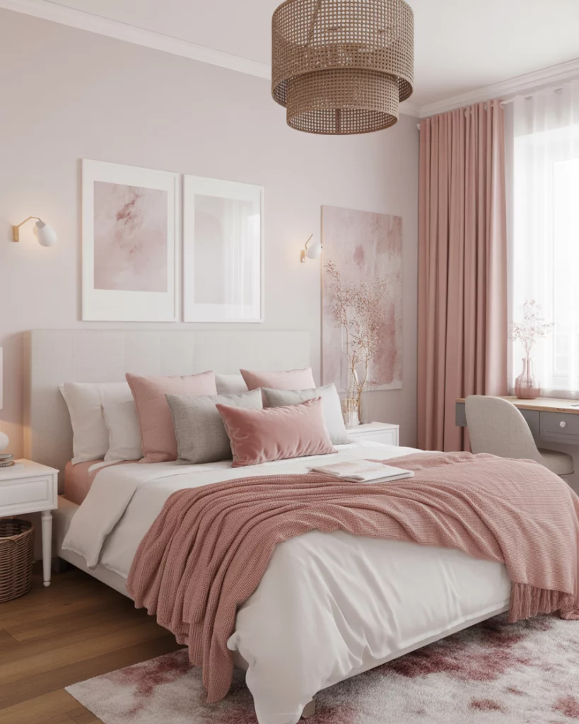 Soft Pink and Grey pink details layered over a white base create a romantic yet modern atmosphere reminiscent of boutique hotels. I once styled a room like this for a teenage girl who wanted something elegant but not overly sweet—adding blush textiles transformed the whole space while keeping it light.