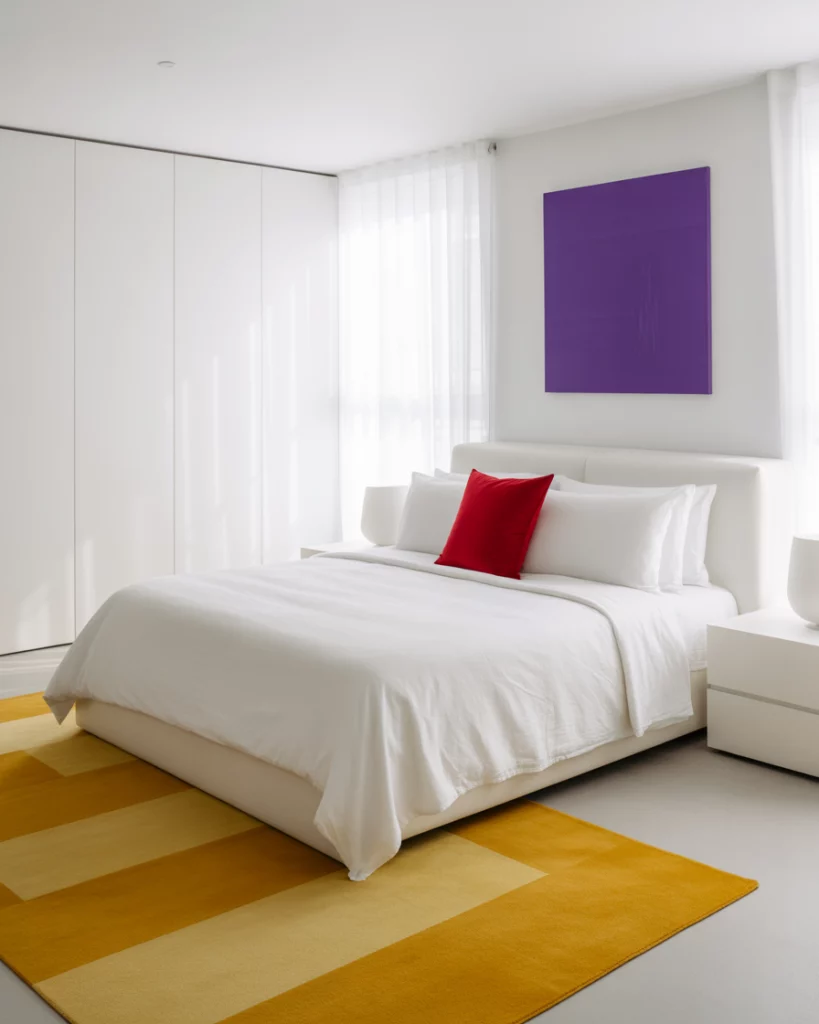 White bedrooms can still be vibrant—just add controlled pops of Red and, Yellow and, or Purple and in bedding or art. I met a young couple who feared color until we added a single red throw; suddenly the whole room felt energized without overwhelming the senses. Perfect for playful for teens spaces.