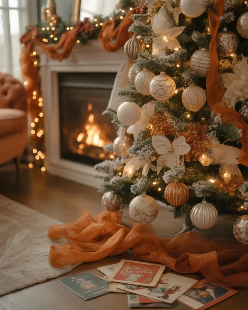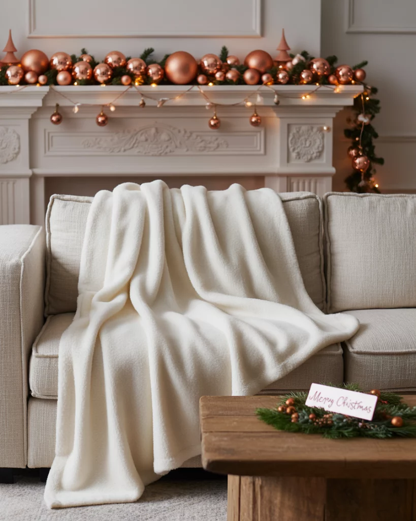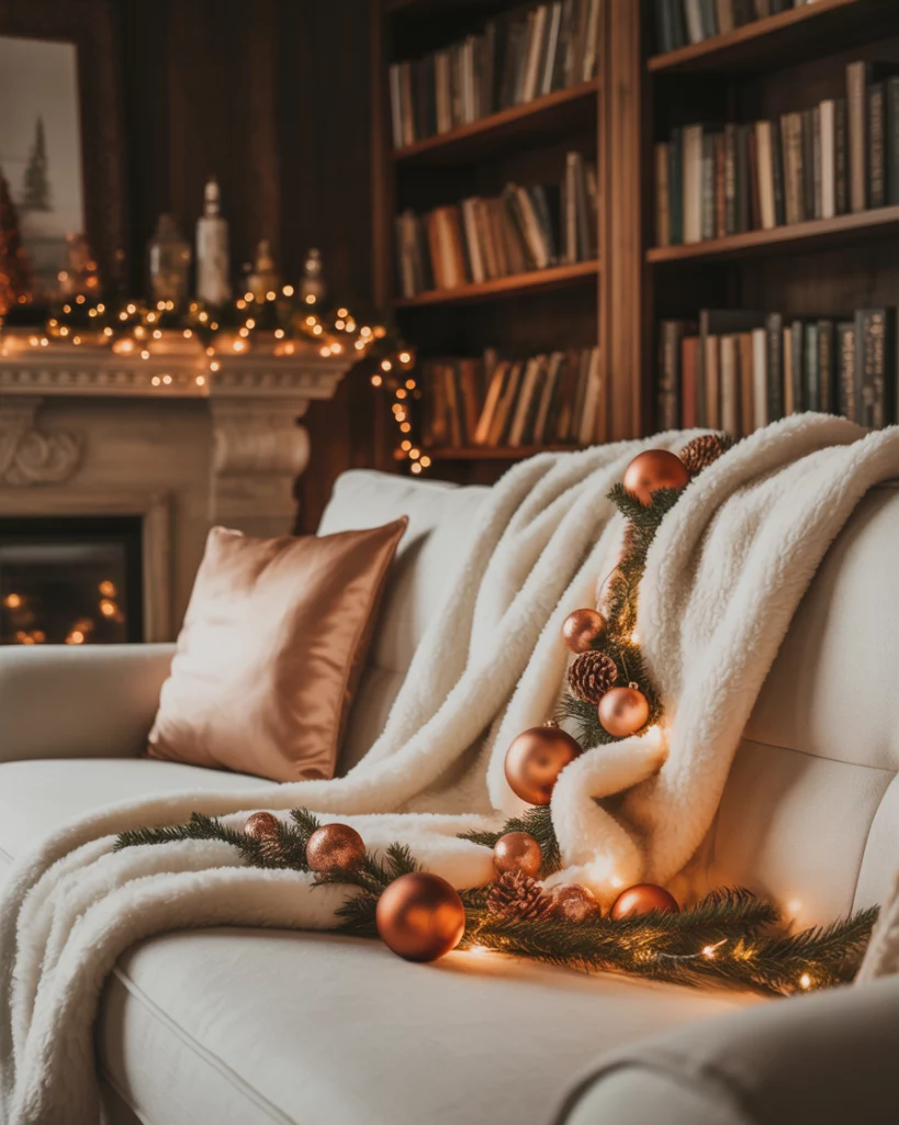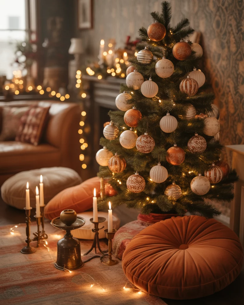 To add a twist to it, combine white and brown and copper. Decorate with copper string lights, terracotta decorations and white knitted throws. This is a very warm and earthy style that is excellent in living room corners or mantel setups. According to designers of West Elm, the next Christmas staple will be copper in 2025.