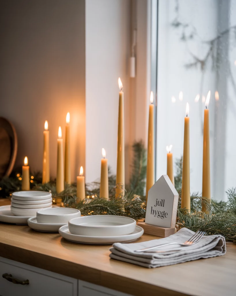 Yellow is not traditional but as it is combined with white, it exudes candlelit coziness. Use mustard yellow taper candles, golden wreaths, and white ceramics to take a gentle diy decorations approach. This is ideal in kitchens or classrooms where you would like to have brightness and no clutter. It is a Scandinavian trend that is increasing in 2025.
