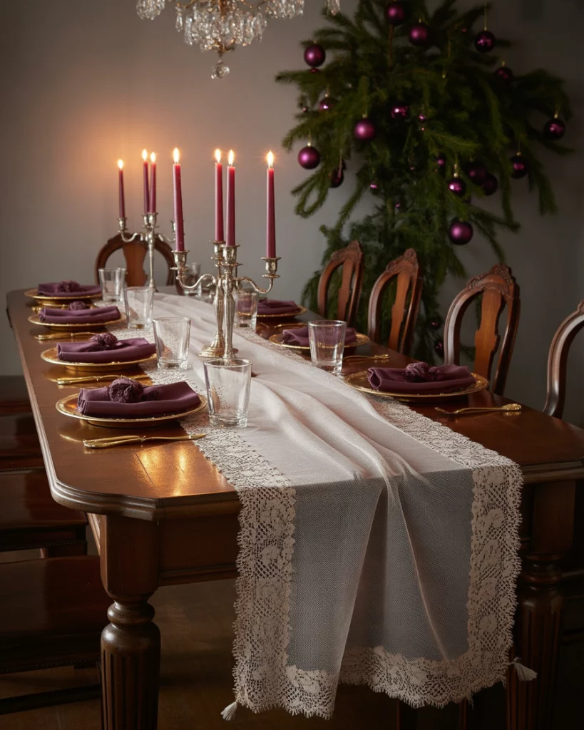 The pairing of snowy white and rich plum sets the stage for a moody, vintage-inspired holiday. Style a romantic table with antique lace runners, gold and candlesticks, and deep purple ornaments for a refined yet nostalgic look. This aesthetic works beautifully for intimate holiday dinners and blends effortlessly into white interiors. Influencers from blogs like My French Country Home often use this palette to evoke timeless European charm in their decorations elegant.