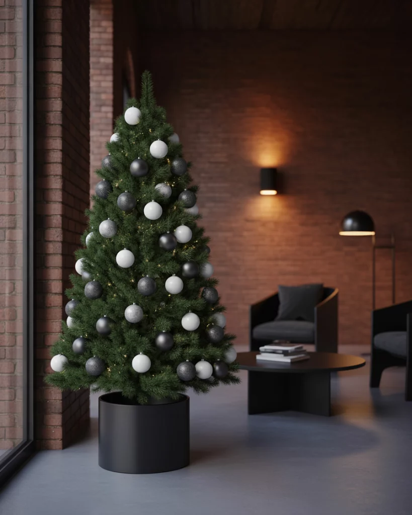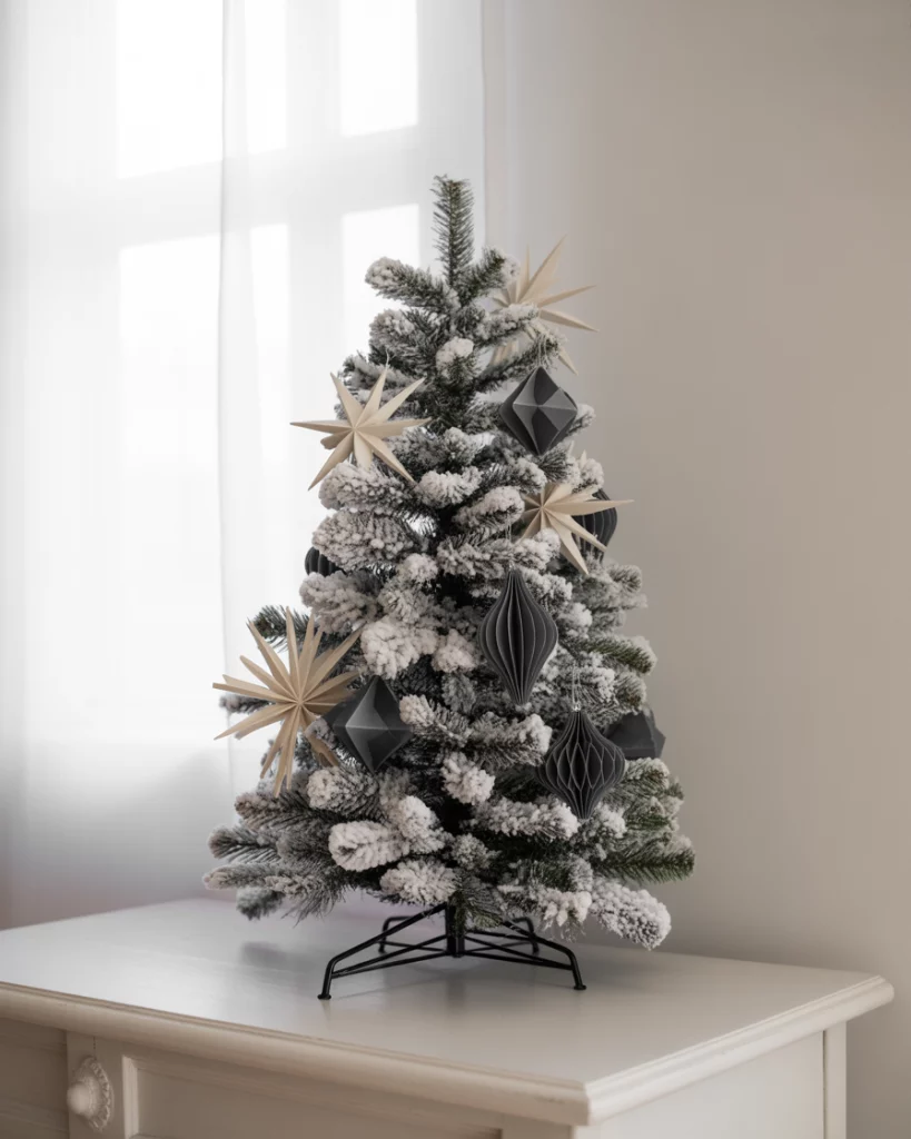 A black and white theme is ideal to people who incline towards Scandinavian simplicity. Decorate with matte black decorations upon the white branches or a snow-flocked tree, with silver and candles or paper stars. The juxtaposition is striking but serene–good in a bedroom or hall. Attach some homemade paper decorations diy to it. The style is based on Nordic apartments that are referenced in the Apartment Therapy articles.