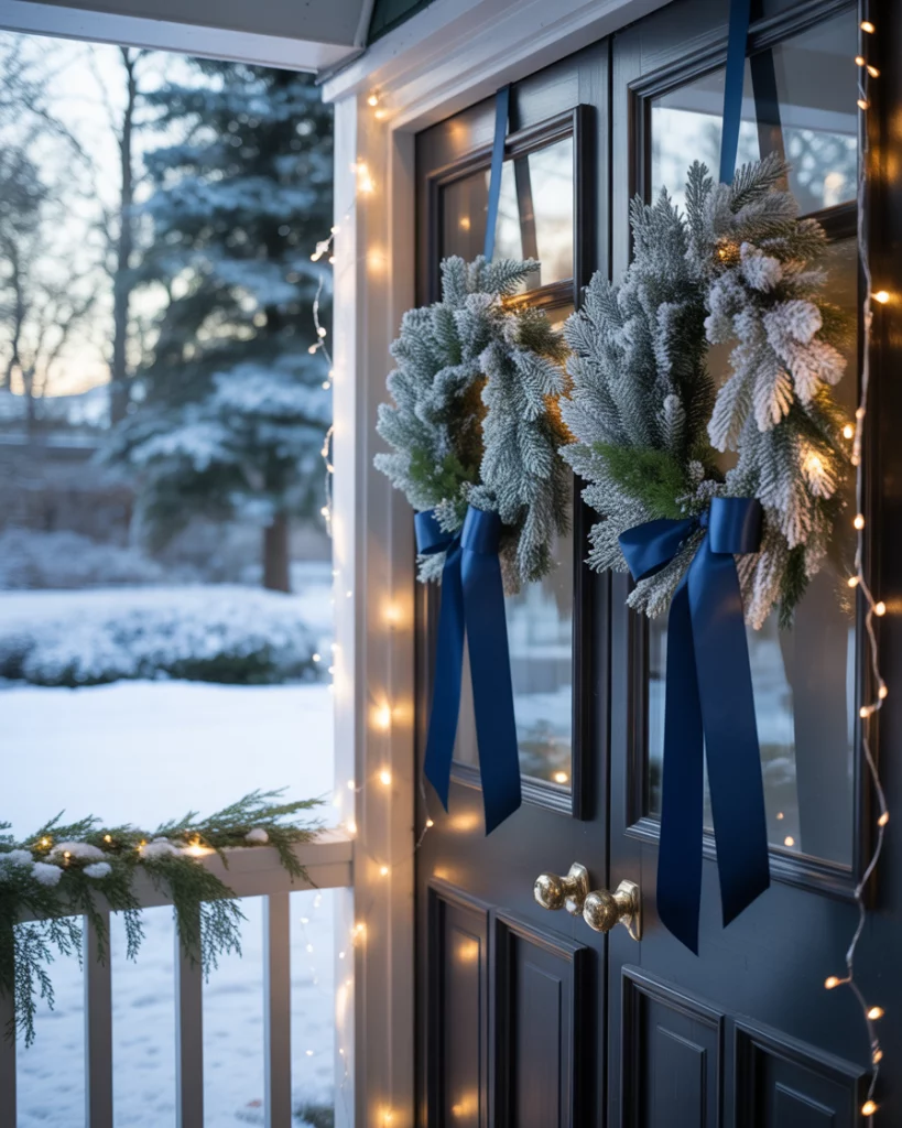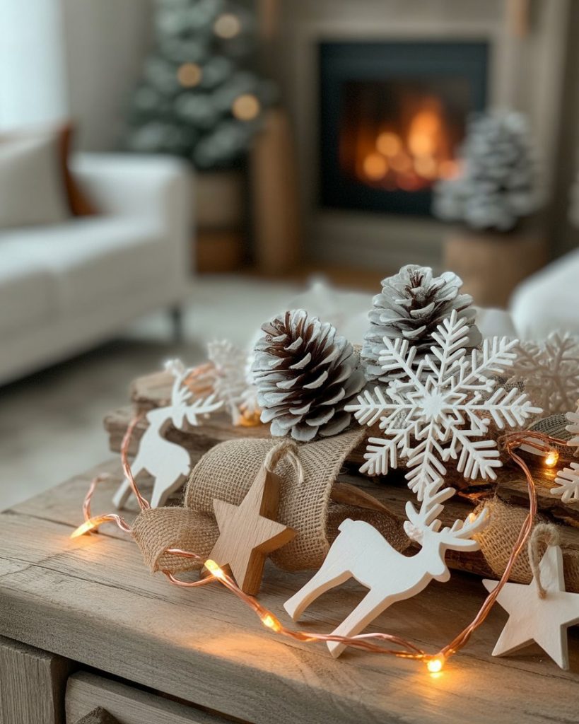 A combination of crisp white and deep green and creates a refined and balanced holiday aesthetic. In a snow-toned living room, incorporate a majestic tree with green gold ornaments, faux snow, and soft twinkle lights. Garlands and wreaths in forest tones complete the upscale look without overwhelming the space. This boutique-inspired style, often seen in Studio McGee’s winter lines, adds depth and serenity—perfect for those seeking elegant but grounded decorations ideas.