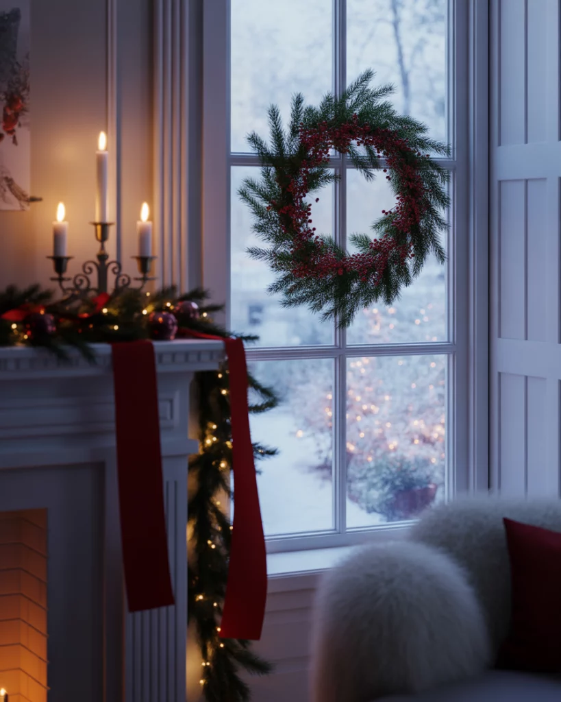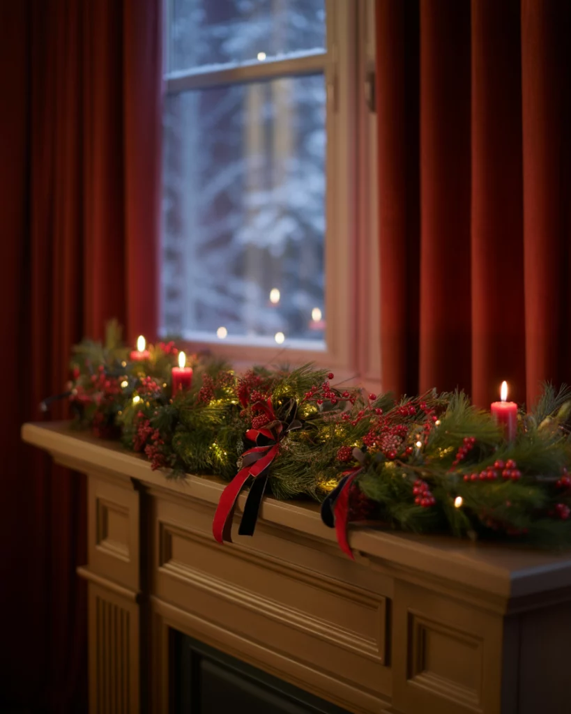 Red black decor makes a bold statement against a white winter backdrop. Imagine a snow-white room lit by warm firelight, with rich red berries, black and velvet ribbons, and dark candles woven into the space. This aesthetic suits those who love contrast and a sense of theatrical coziness—especially in a formal living room or moody holiday corner. It balances festive energy with deep sophistication and is gaining traction in decorations ideas for those tired of clichés.