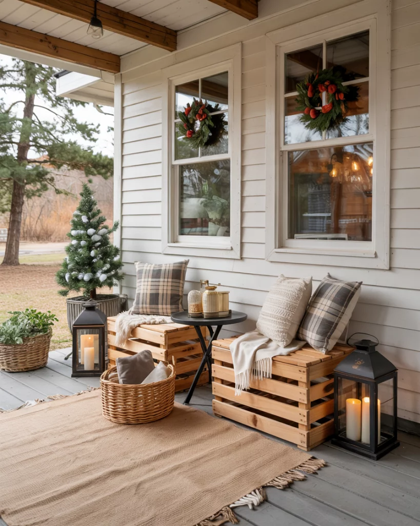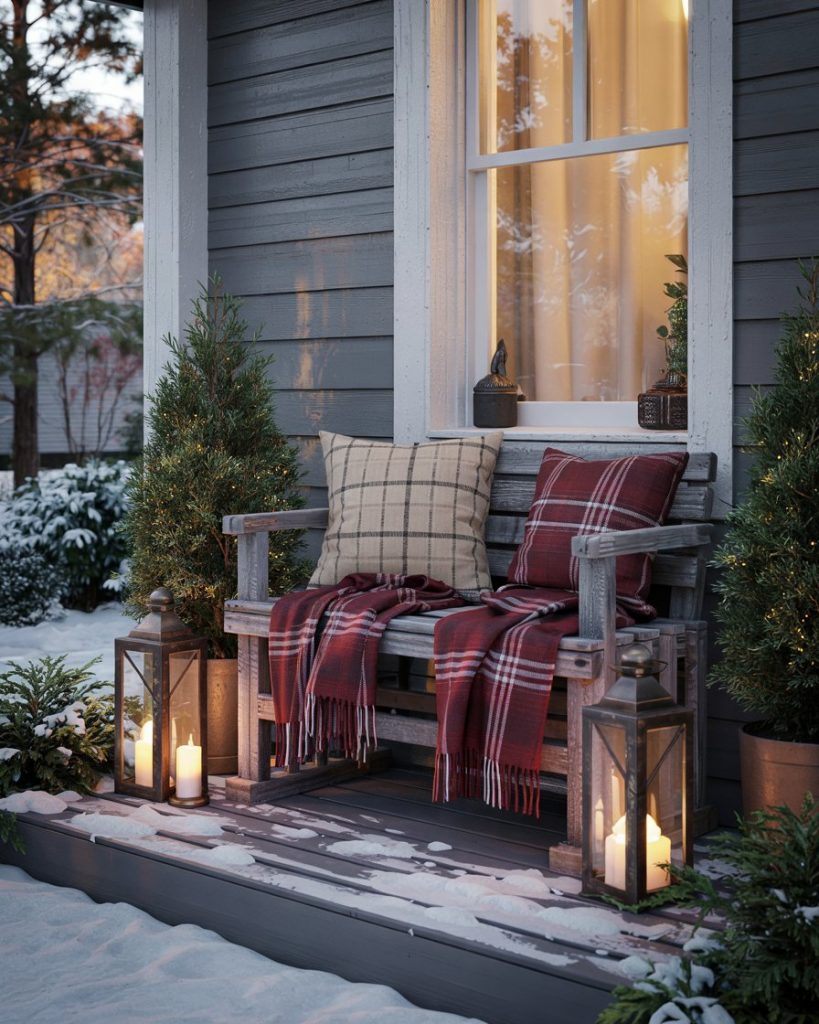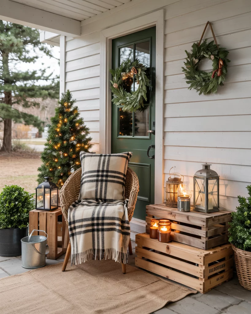 Making a small front porch into a seasonal oasis gives the overall vibe for the house. Lanterns, plaid blankets, and a few Dollar Tree items should keep the space inviting, even if on a small scale. Using natural garlands and a simple wreath allows for a timeless design, while repurposed crates or benches bring utility into the mix. Such styling simply glues the entryway together, imparting this little winter hug to all who step across the threshold.