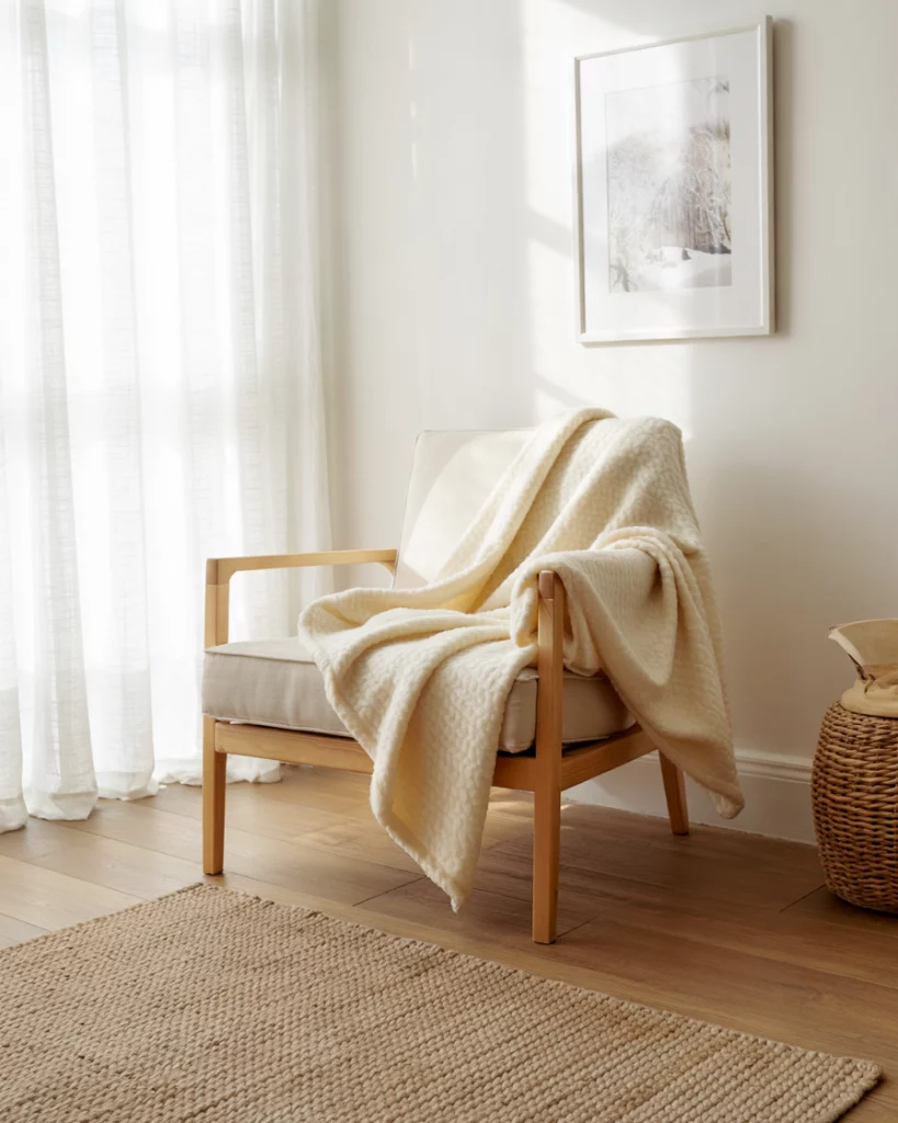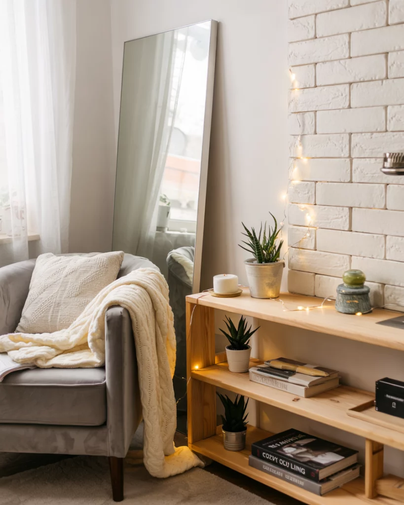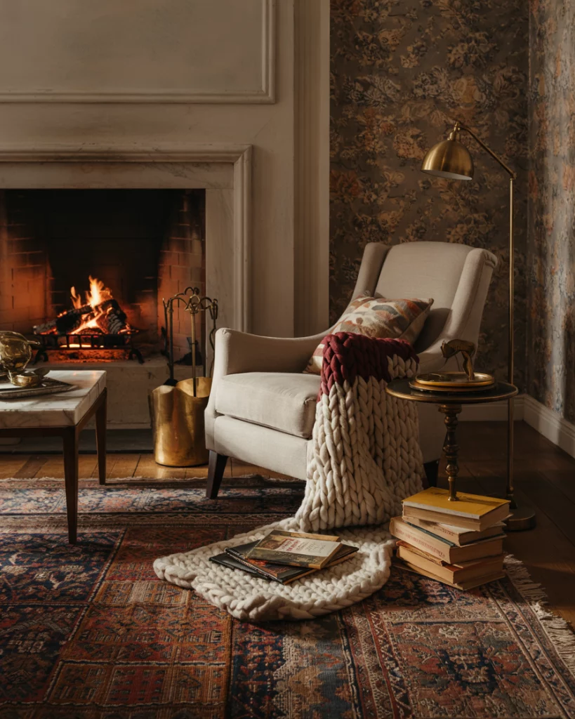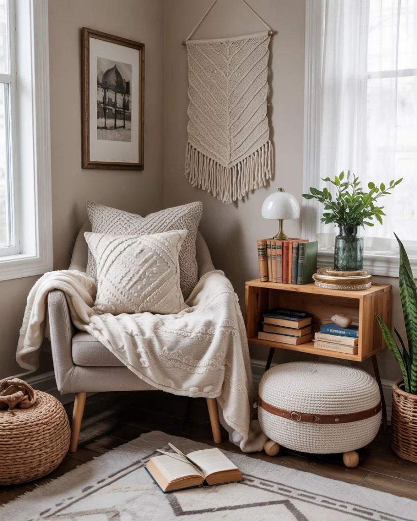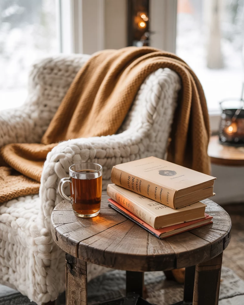 Nothing feels more inviting than a reading corner with soft lighting and textiles. A chair with chunky knits draped over it, a repurposed side table, and shelves styled with vintage books all make a perfect retreat for the home cozy; even tiny apartments get their charm from these nooks. Many interior bloggers recommend tying the whole vibe together with a warm-glow lamp.