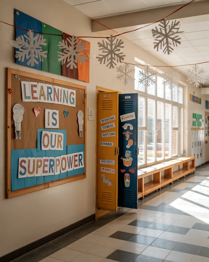 Winter décor can build an atmosphere for school hallways or classrooms. DIY snowflake banners, string lights, and repurposed bulletin boards create a festive scene for the school. These small touches help both students and teachers embrace the season. I have seen hallways converted to snowy wonderlands with very little more than cotton batting and construction paper.