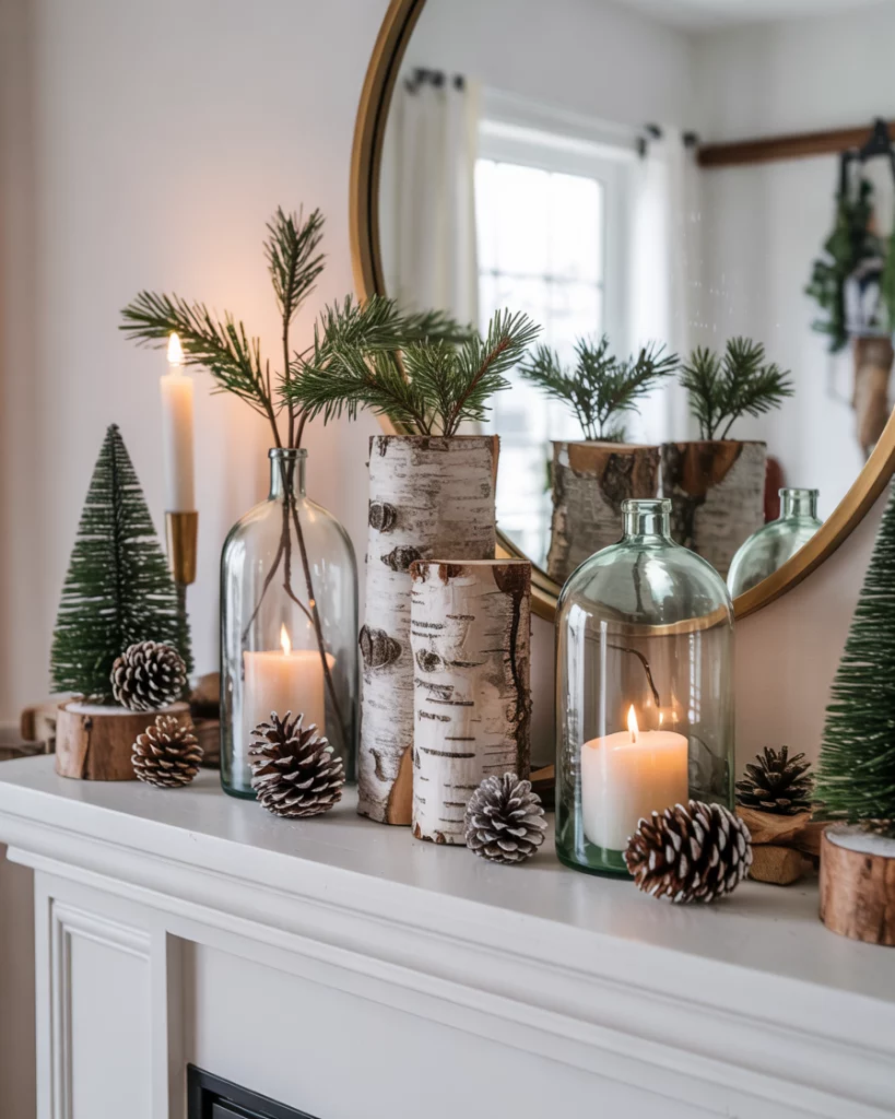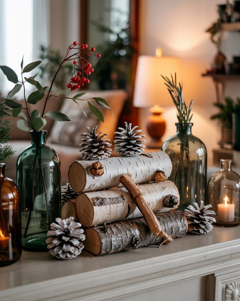 Once the stockings are put away, mantels still have a chance to shine. Transition into a winter look with styling birch logs, frosted pinecones, and repurposed glass bottles as vases. This is a crisp, modern solution for fireplaces that sings loudly post-Christmas. The mantel steals attention again but without feeling too focused on the holidays.