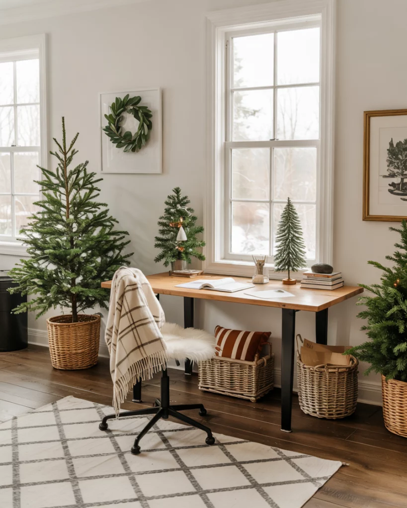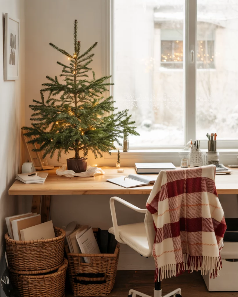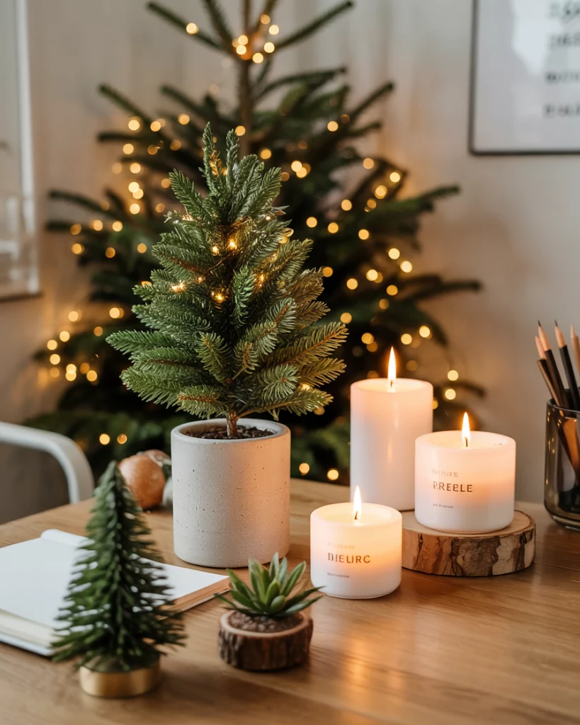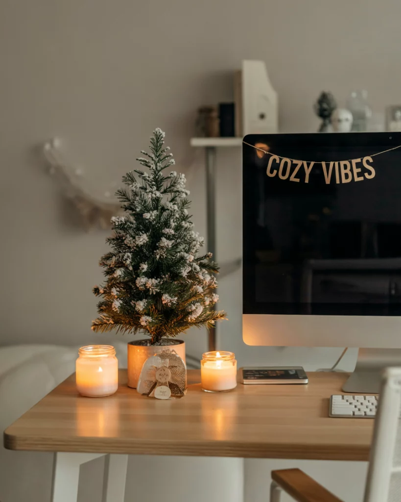 A little seasonal touch in the office goes a long way. Small evergreens on desks, natural soy candles, or hanging garlands across cubicles all create warmth without distractions, making them perfect and practical for the office. I personally put a mini tree on my desk once, and many coworkers kept coming over every day to appreciate it.