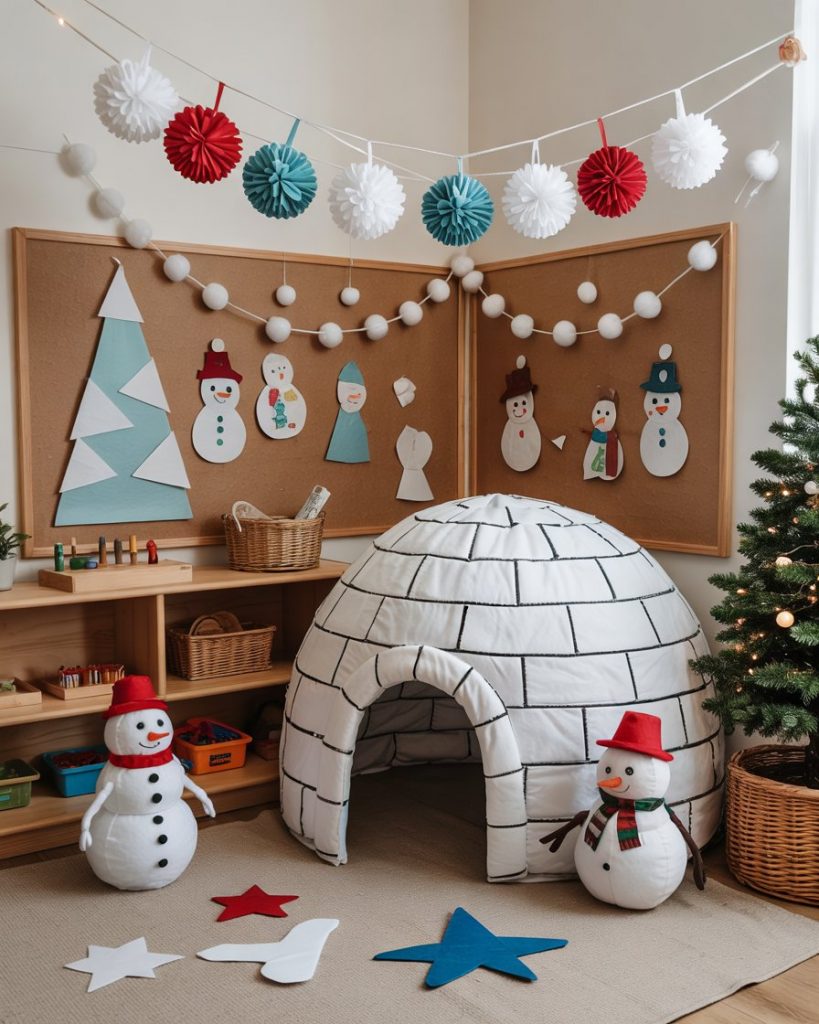 Kindergarten decoration should be whimsical and interactive. That includes DIY felt snowmen, cotton snow garlands, and repurposed cardboard igloos where kids can play. The décor isn’t just visual; it becomes part of the kids’ activities. Seasonal decoration in this way helps children relate to winter in a fun, safe, and educational manner.