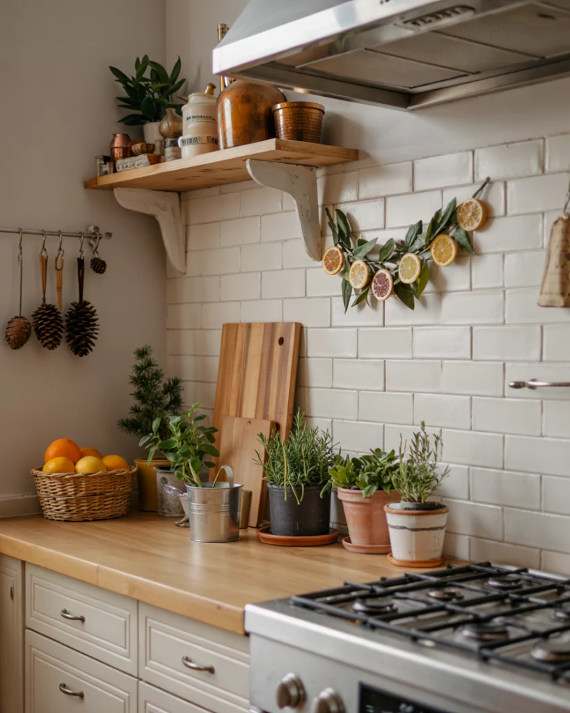Bringing the natural vibe into the kitchen adds freshness and warmth in winters. Pinecone, garlands of citrus slices, or small potted herbs create a seasonal feel but stay in utility. These are more apt for the home cozy kind where cooking meets gathering. Natural accents even spice up small spaces by pulling life and fragrance into the center of the home.