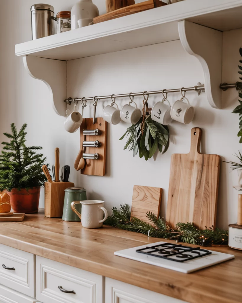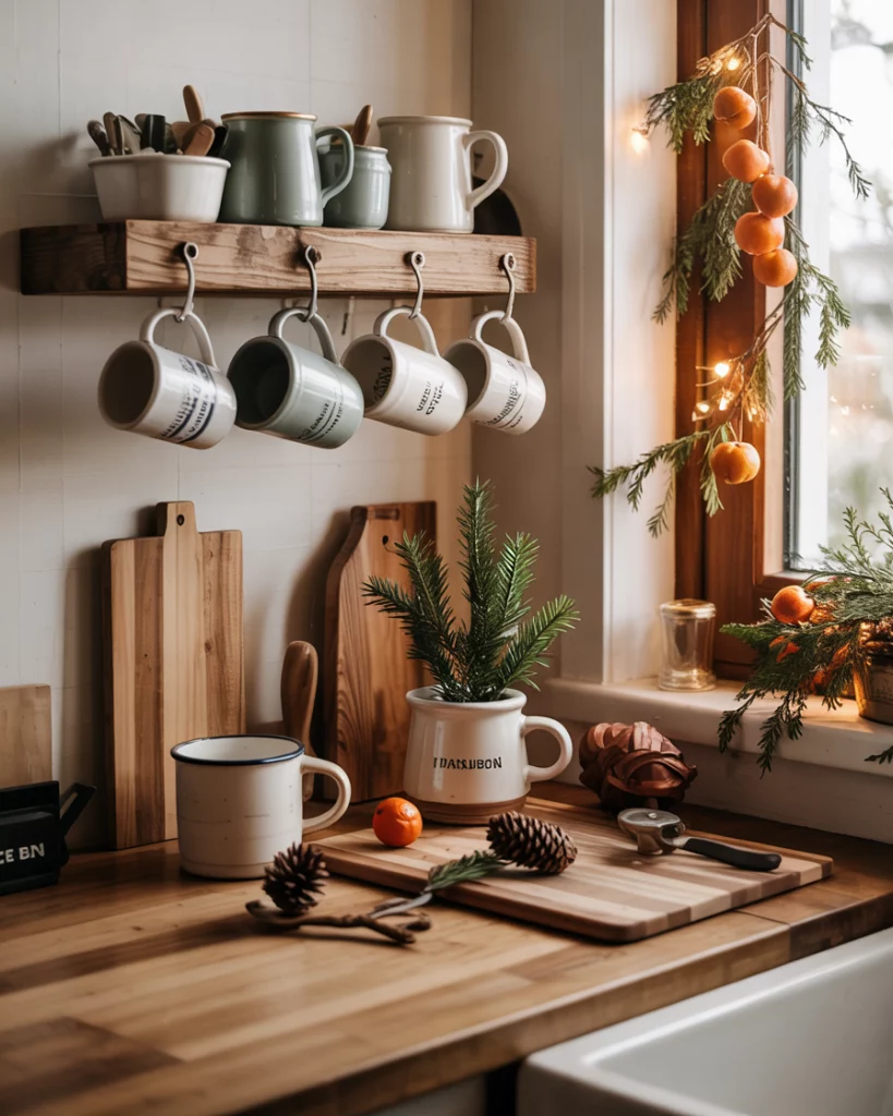 Kitchens tend to take center stage in winter, especially when styled for home cozy. Picture DIY mug racks with seasonal ceramics, repurposed cutting boards as trays for serving, and garlands draping down shelves. Just a few accents of spiced candles or dried oranges will set the tone for a warm welcome on cold mornings! It proves that utilitarian rooms also deserve warmth and character.