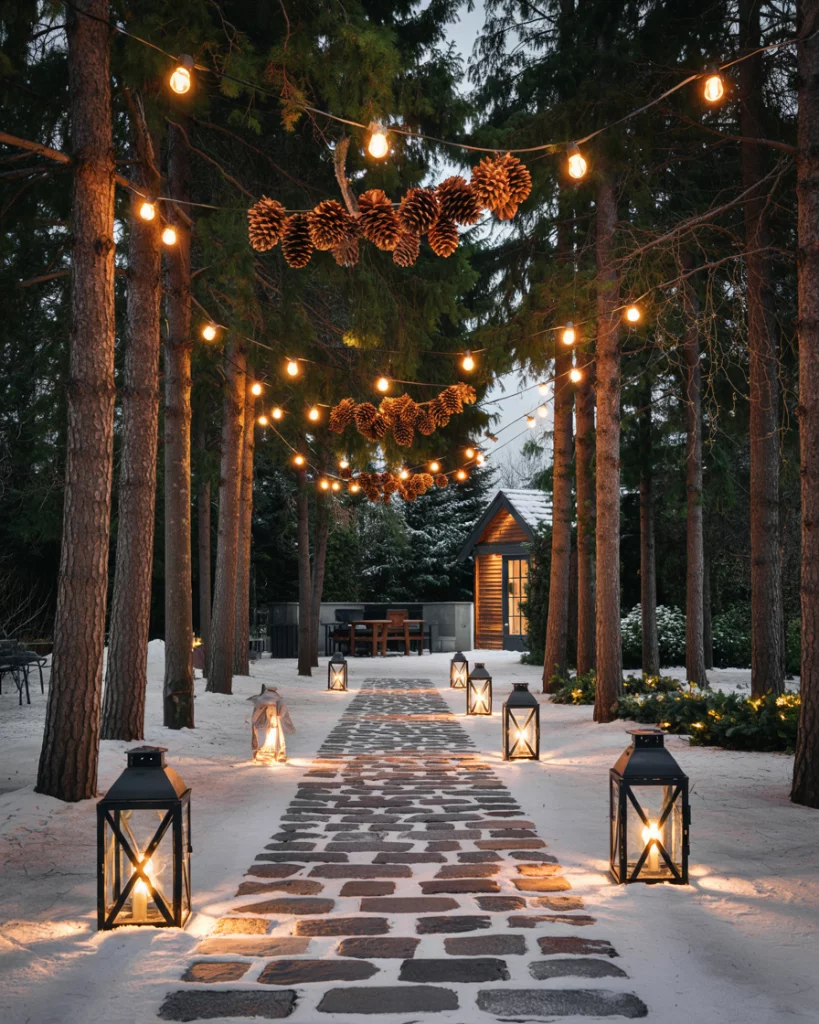 Winter decorating need not be restricted indoors—the outdoors can sparkle with a few touches from their side. Wrap fairy lights around trees, hang natural pinecone garlands, and place lanterns along pathways. This magic proves to be a hit for small porches and balconies alike, assuring a lasting atmosphere well beyond Christmas. Moreover, this style doubles effusively for entryways, showering guests with charm before stepping in.