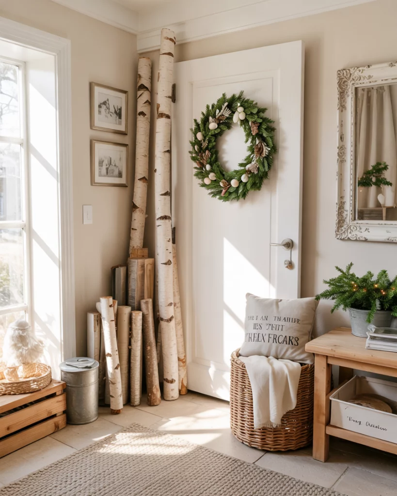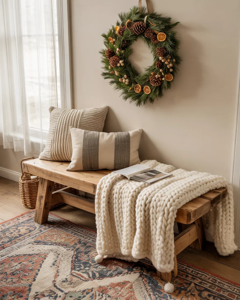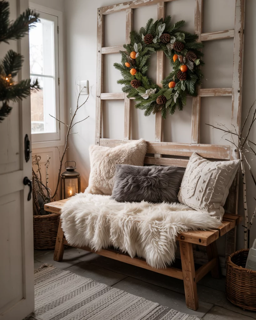 Often overlooked, entryways promise the spirit of winter style. Layer rugs, natural wreaths, or repurposed benches in for the home cozy style to greet guests. Hanging hooks for scarves and hats demand nothing but decoration from the space. This approach fits any house size, even small spaces, to bring a sense of order to the seasonal clutter of boots and coats.